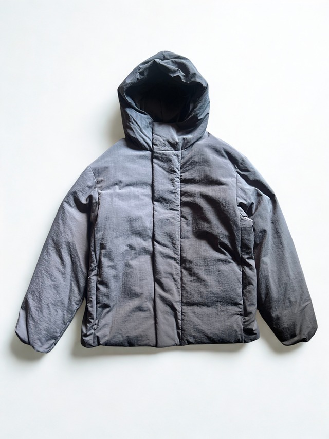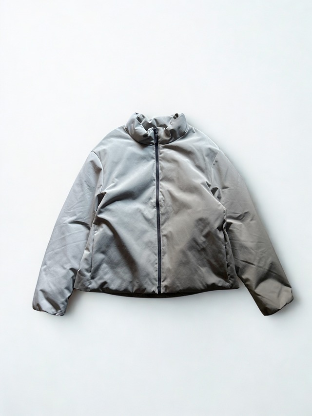 綿ポリエステルツイルを使用した中綿入りのショートジャケット。 身頃の裏地はフリースを使用し、袖の裏地はナイロンと中綿キルティングを採用。 ミリタリーモチーフの両脇ポケットと胸元にジップ付きのポケット。 フロントは逆開のジップでの開閉とドットボタンを使用。 脇のパネル切り替えや背中のヨークで丸みを帯びたシルエットを作成。 広めに開けた襟元はフード