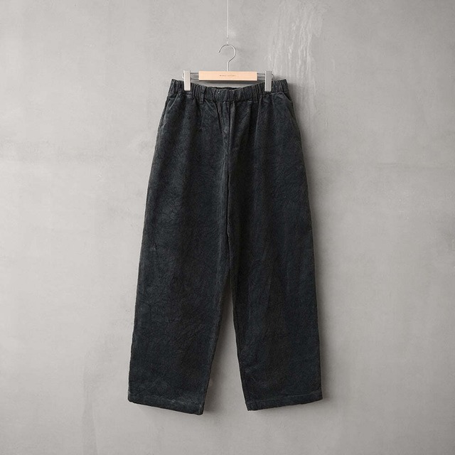 10ウィル コーディロイ イージーパンツ 太畝のストレッチコーデュロイのイージーパンツ。 シルエットは腰回りからゆとりを持たせ、裾までストンと落としたワイドパンツです。 ただ裾上げいらずのレングスに設定しているので、太目ですがスッキリしており、幅広いスタイルに対応してくれます。 素材には10ウェルの太畝のコーデュロイを仕様。 適度な光沢感とハリがポイントで、カジュアル過ぎずキレイ目な印象が特徴です。 上品な雰囲気のコーデュロイはキレイ目なアイテムにもビンテージ感のある古着のようなアイテムとも相性が良く、幅広いコーディネイトで活躍してくれます。