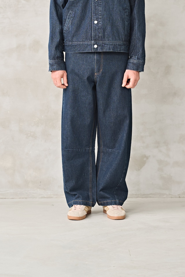 もも周りから裾にかけて、特徴的なボリュームを持たせたバレルレッグパンツが新登場! コーディネートの主役になるインパクトあるボトムで、合わせ方によってカジュアルにもモードな雰囲気にもなる楽しいアイテムです。 デニム素材なので一見カジュアルですが、程よく落ち感が出る様に生地選びや加工を施しているので、一味違った大人な空気感があります。 生地にはデニムの名産地岡山産の10ozデニムを使用。 重厚感を失わない程度のライト目なデニムを縫い上げてから、ボールバイオ加工しているので柔らかく軽やかな着用感です。 一年中着用出来る生地厚なのも嬉しいポイントです。 主役級のパンツですので、シンプルなトップスと合わせると良さが引き立ちます。 アウターを合わせる場合はショートブルゾンやコーチジャケットなど、比較的短めの丈がお勧め。