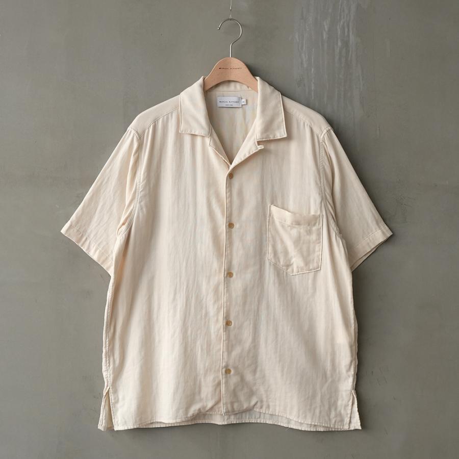 また反応染料と自然染料を融合させ、絶妙な色合いに染められているのも特徴です。形は横幅にゆとりを持たせたスクエア型のオープンカラーシャツで、ナチュラルな色目、素材ですが、どこか色気のある佇まいに仕上がりました。