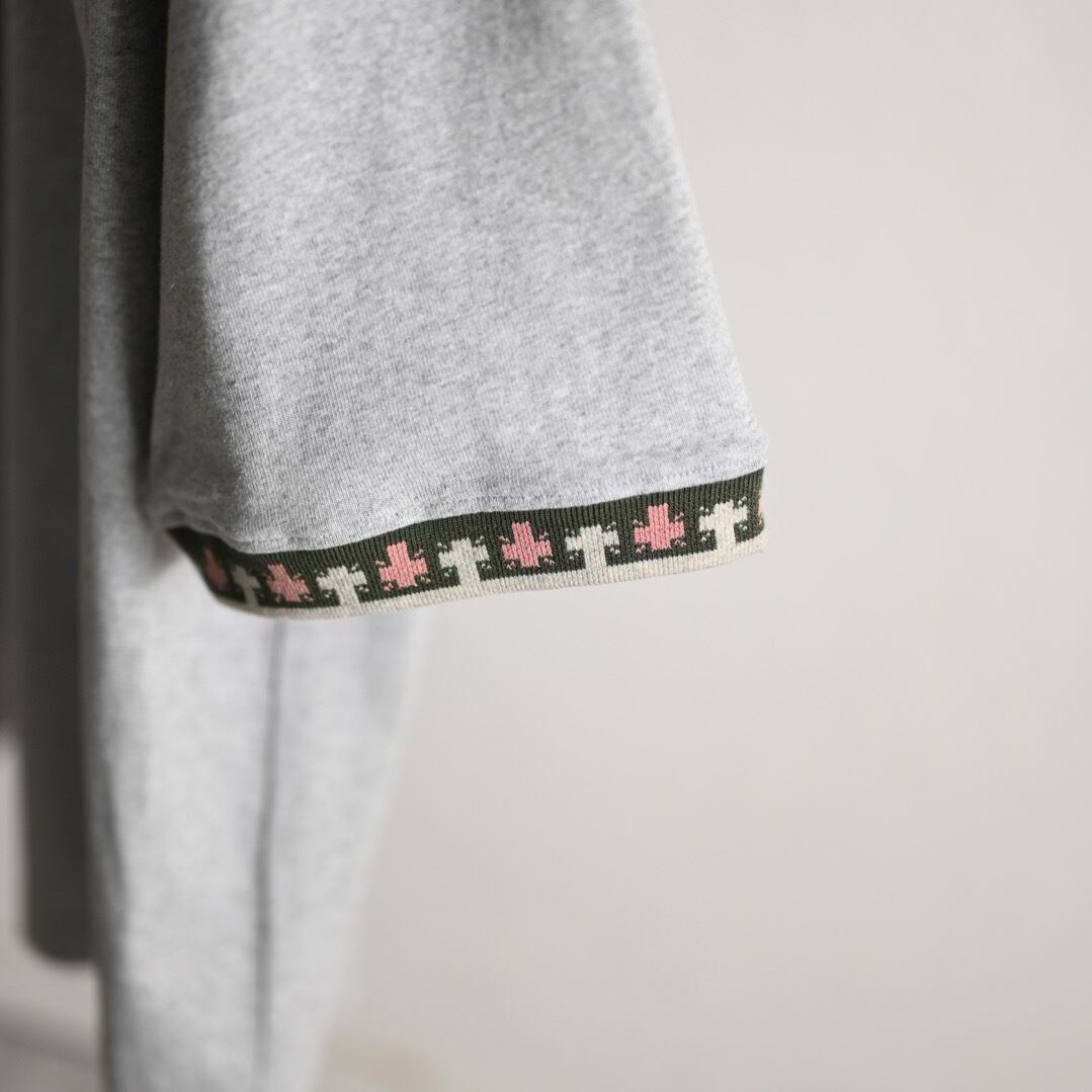 ジャガードで柄を表現したリブが襟元、袖元に配置された印象的なデザインTEEはレトロなスケートストリートを感じさせてくれます。12番糸NO太めの糸を度詰めで仕上げた本体に同色同素材でポケットが付き、そこにブランドピスネームも挟み込んでます。