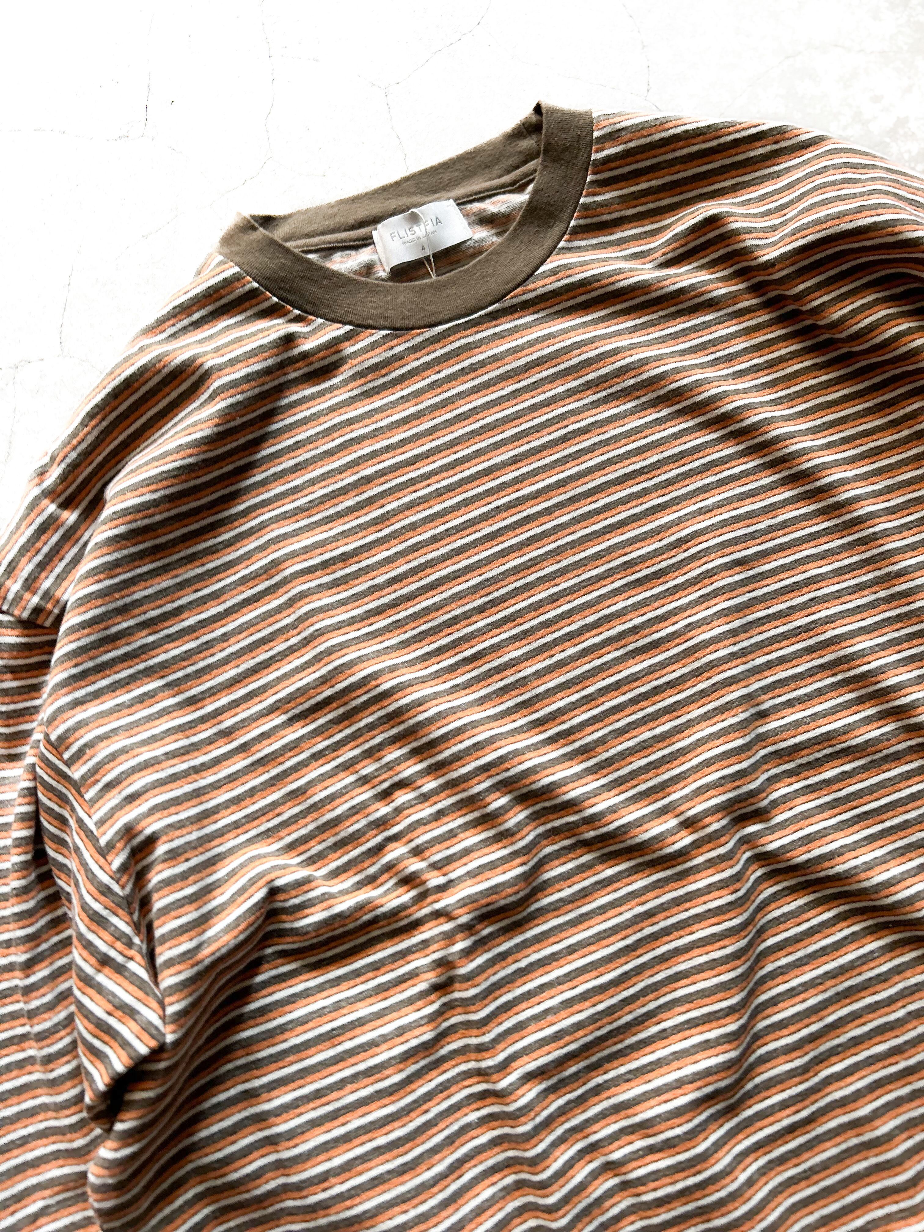 レトロな配色のボーダーロングスリーブTは裾にスピンドルを入れる事で丈の調整やボリューム感を楽しめます。