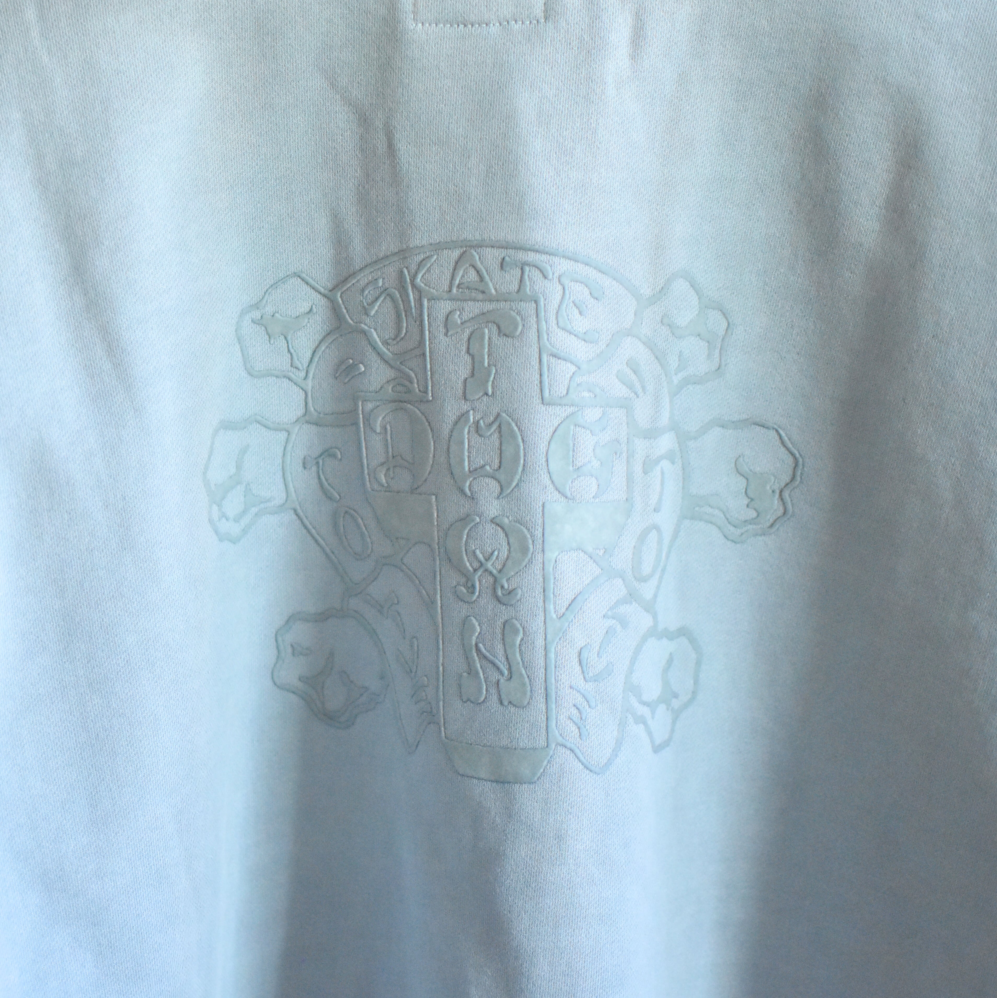 バックプリントに”SKATE TO LIVE”グラフィックがフロッキープリントで同色で配置、フロントはクロスロゴが刺繍で同じく同色で配置された落ち着いた雰囲気のクルースウェット。12ozのヘヴィー過ぎないしっかりとした度詰め生地にピグメント加工を施し、エイジング感を出してますが全体的に綺麗な仕上がりです。