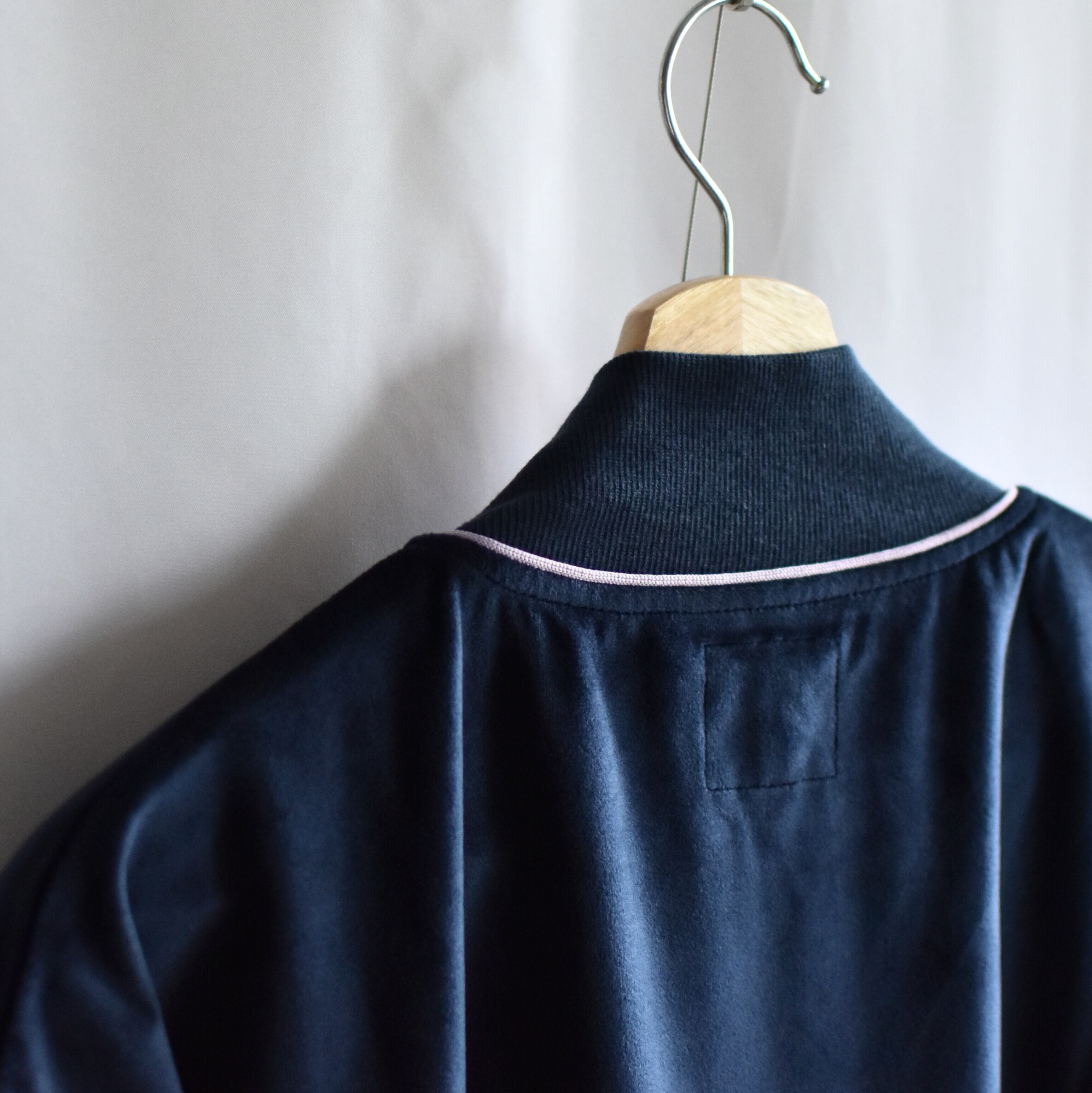 ベロアのフルジップトラックJKT。NAVYに対してライトパープルカラーパイピングと切り替え配色がポイントのオールドスクールなストリートを感じる一枚です。