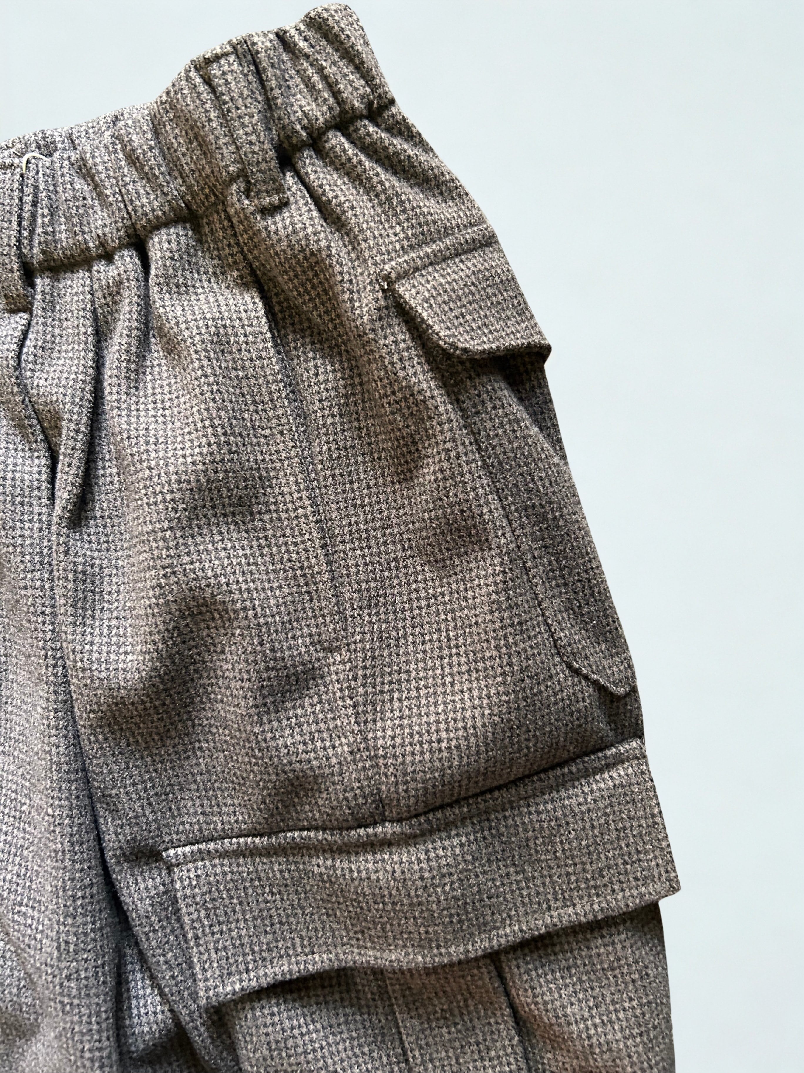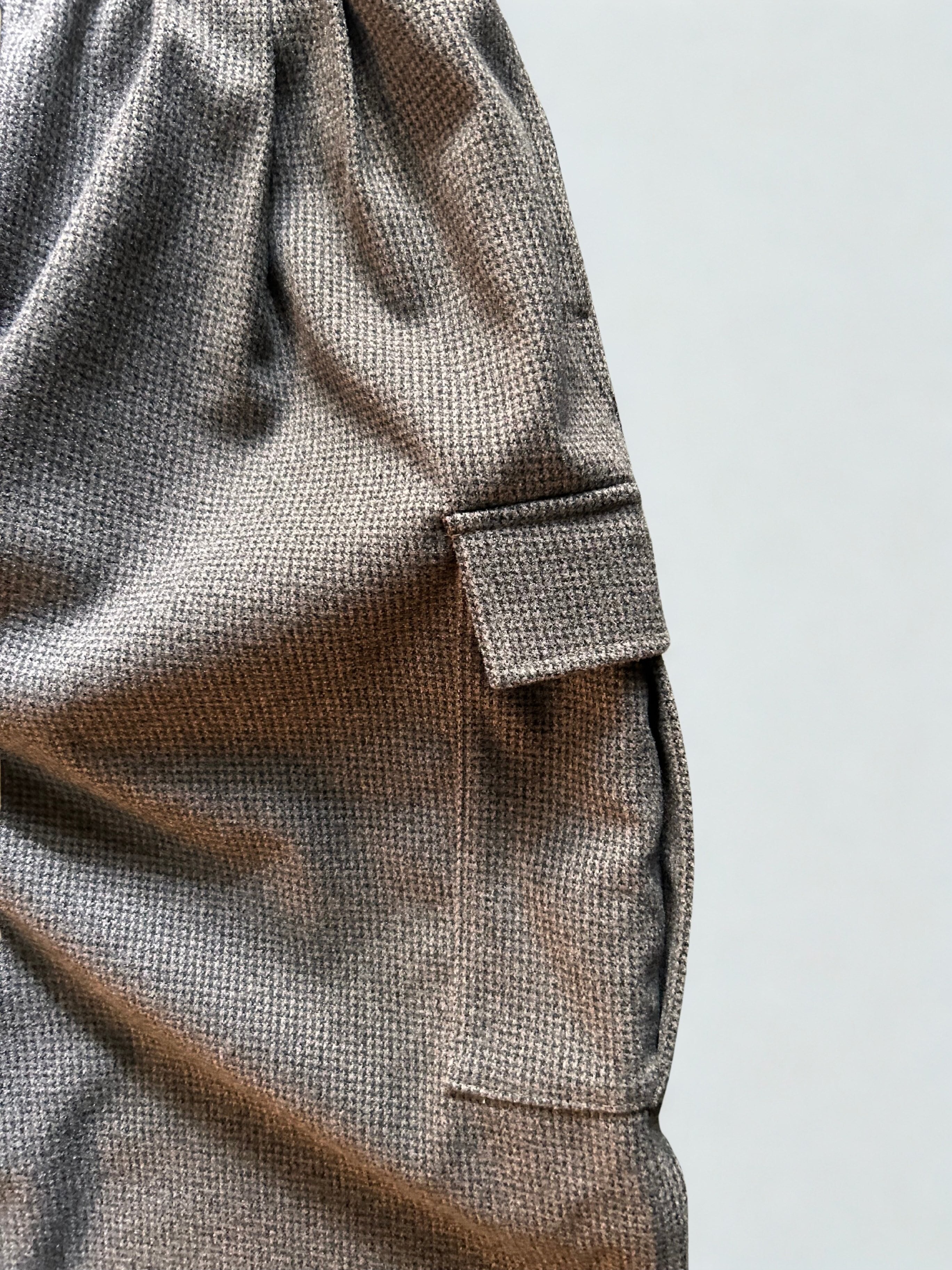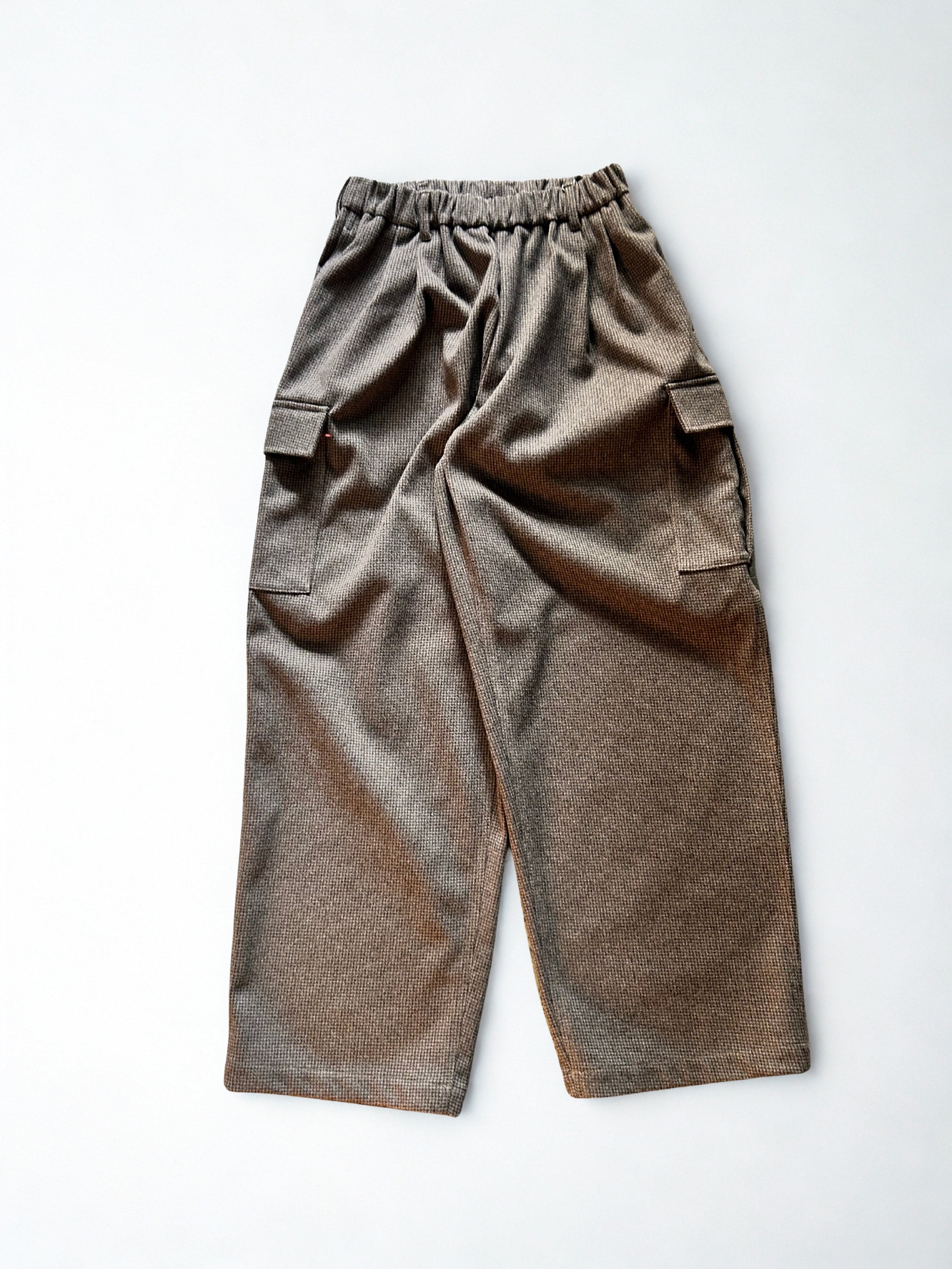 英国っぽい雰囲気のトラッドな千鳥生地になります。ウールのように見えますがエステル素材になっていたり、布帛のようにも見えますがカットソー(ニット素材)だったりと、ウールライクかつ布帛ライクな、エステルのカットソー素材になります。ニードルパンチで起毛感と布帛っぽい硬さと伸縮を抑えた加工を施しています。エステル素材ですのでウールのようにチクチクする事もなく、水洗いで大きく縮む事もありません。またカットソー素材ですので、軽くてリラックスした快適な着心地になります。