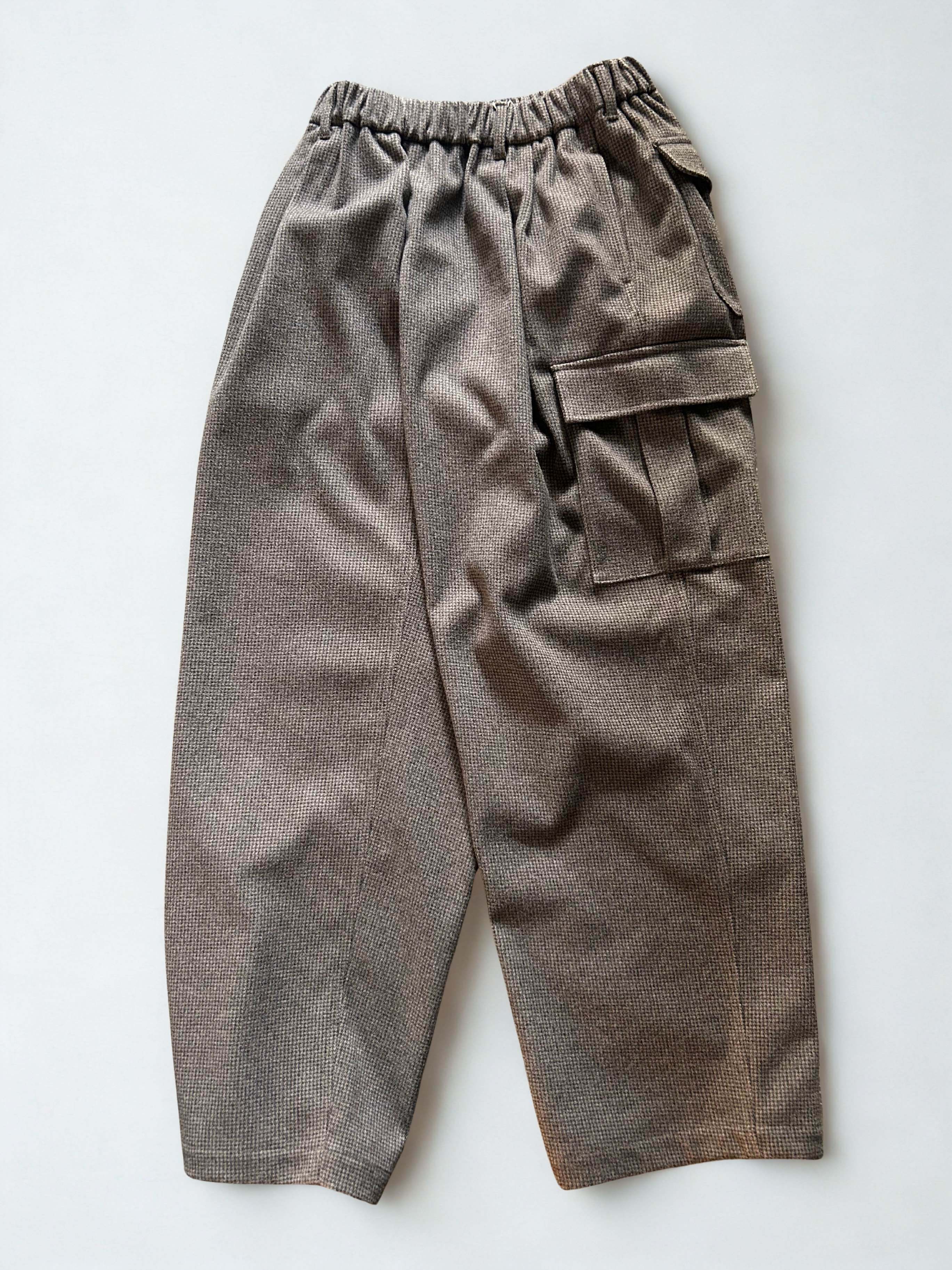 従来のパンツの型よりワイドで余白のあるシルエットになっています。フルレングスの丈はワンクッション程で、それほど長くはしていません。ヒップ、渡り、ヒザを大きく作っており、裾にかけてあまり絞らずにストンと落ちるシルエットにしています。ツータック入りですが、センタークリースを入れずにカジュアルに寄せたパンツにしています。ウエストはゴムしっかり収まるジャストな設定になっています。納品の際にタック入りですがセンタークリースを入れていないので、スラッ