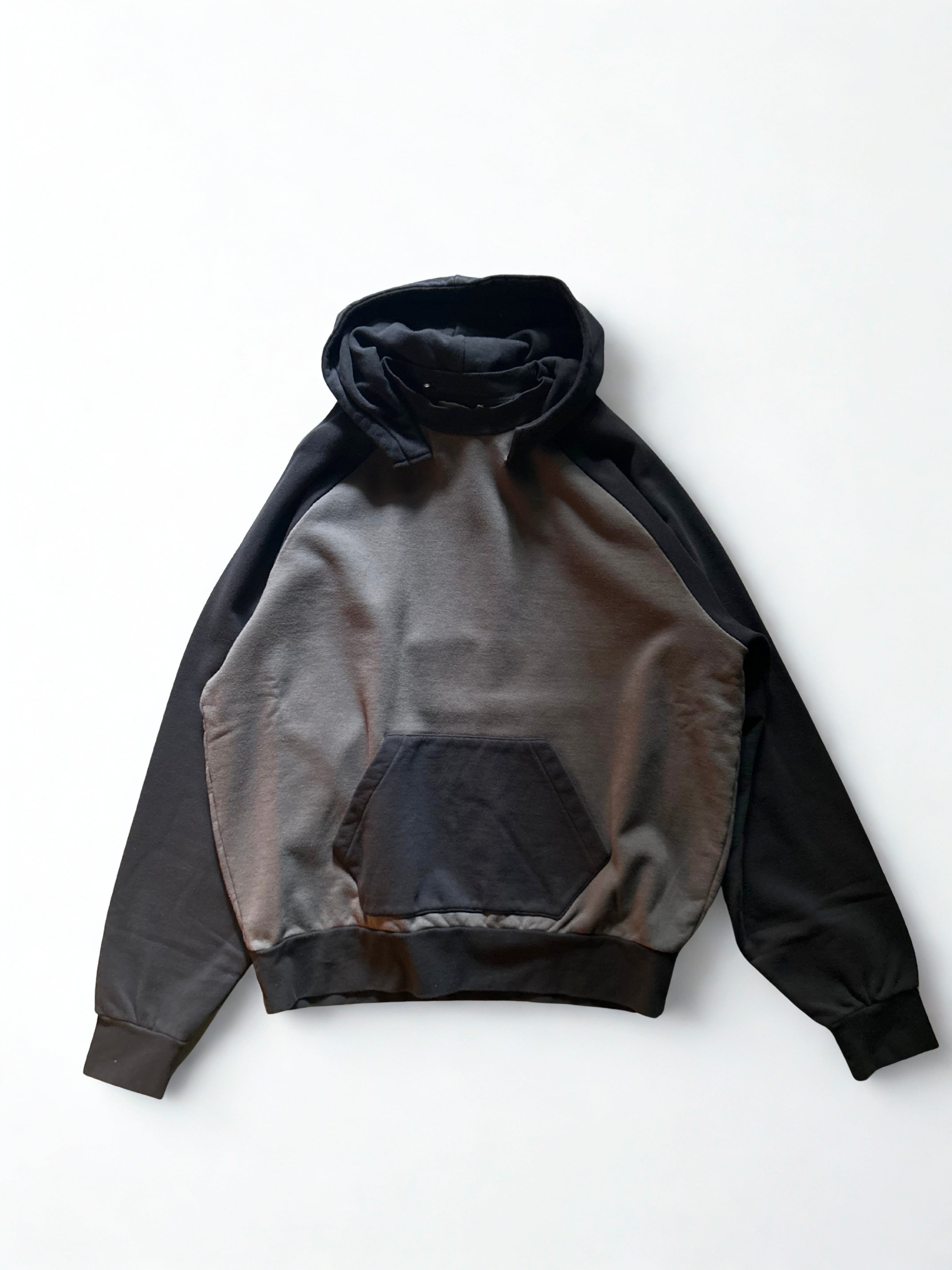 "旧式の編み機でゆっくり編み立てた裏毛になります。空気を含んだふっくっらとした柔らかな風合いが特徴です。旧式の編み機で編みながら、敢えて上質なコンパクト糸を使用していますので、少しツヤ感のある綺麗な質感になっています。一般的な旧式の編み機で編んだ粗野でカジュアルな雰囲気にしたくなくて、旧式の編み機ならではの柔らかな風合いは残しつつ、質感は綺麗な雰囲気に。後付けパーカーでヴィンテージライクなツートンながら、敢えて質感を綺麗にする事で、古着っぽくならずに、ちょっと上品で都会的な塩梅に仕上がっています。後付け仕様のパーカーで、フードは首に綺麗に収まるように作っています。