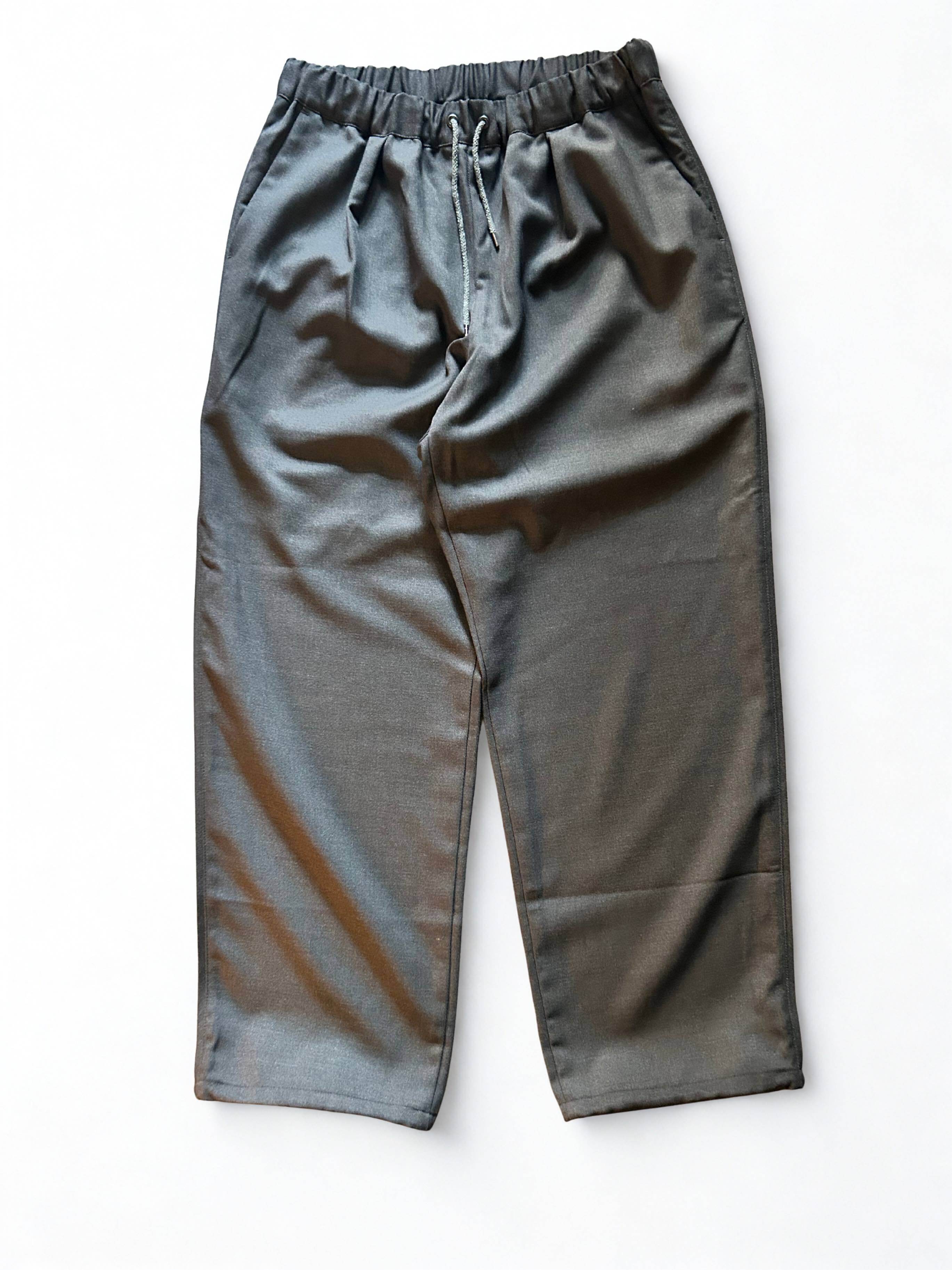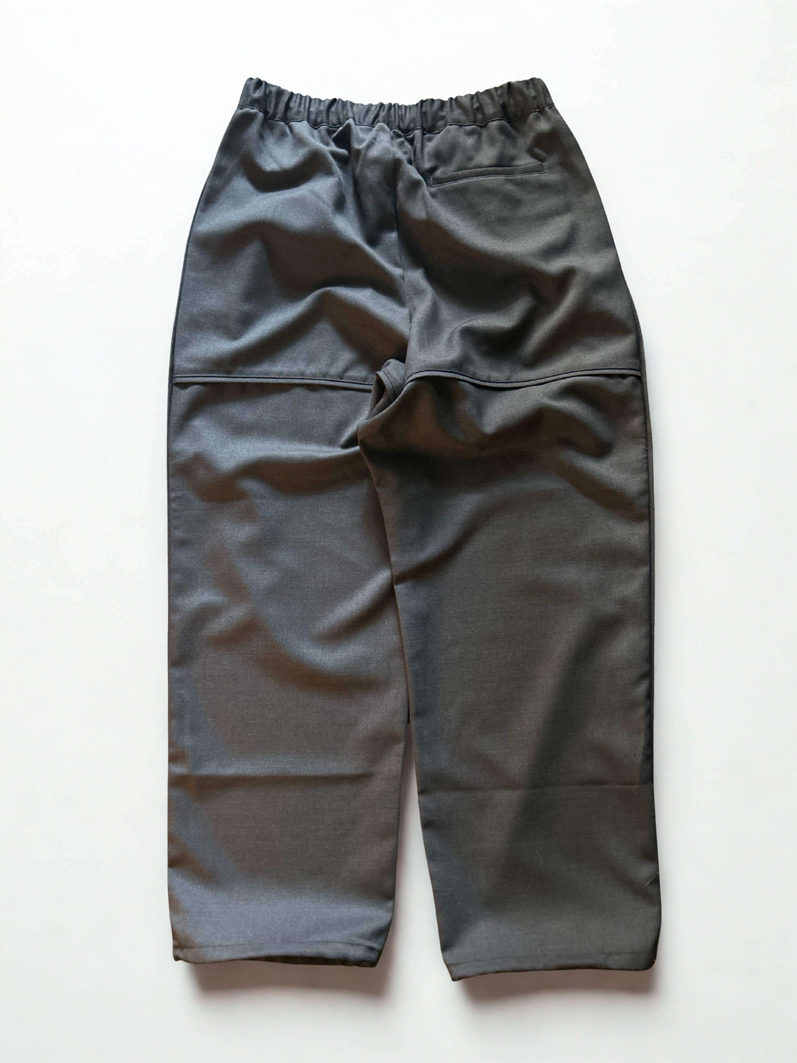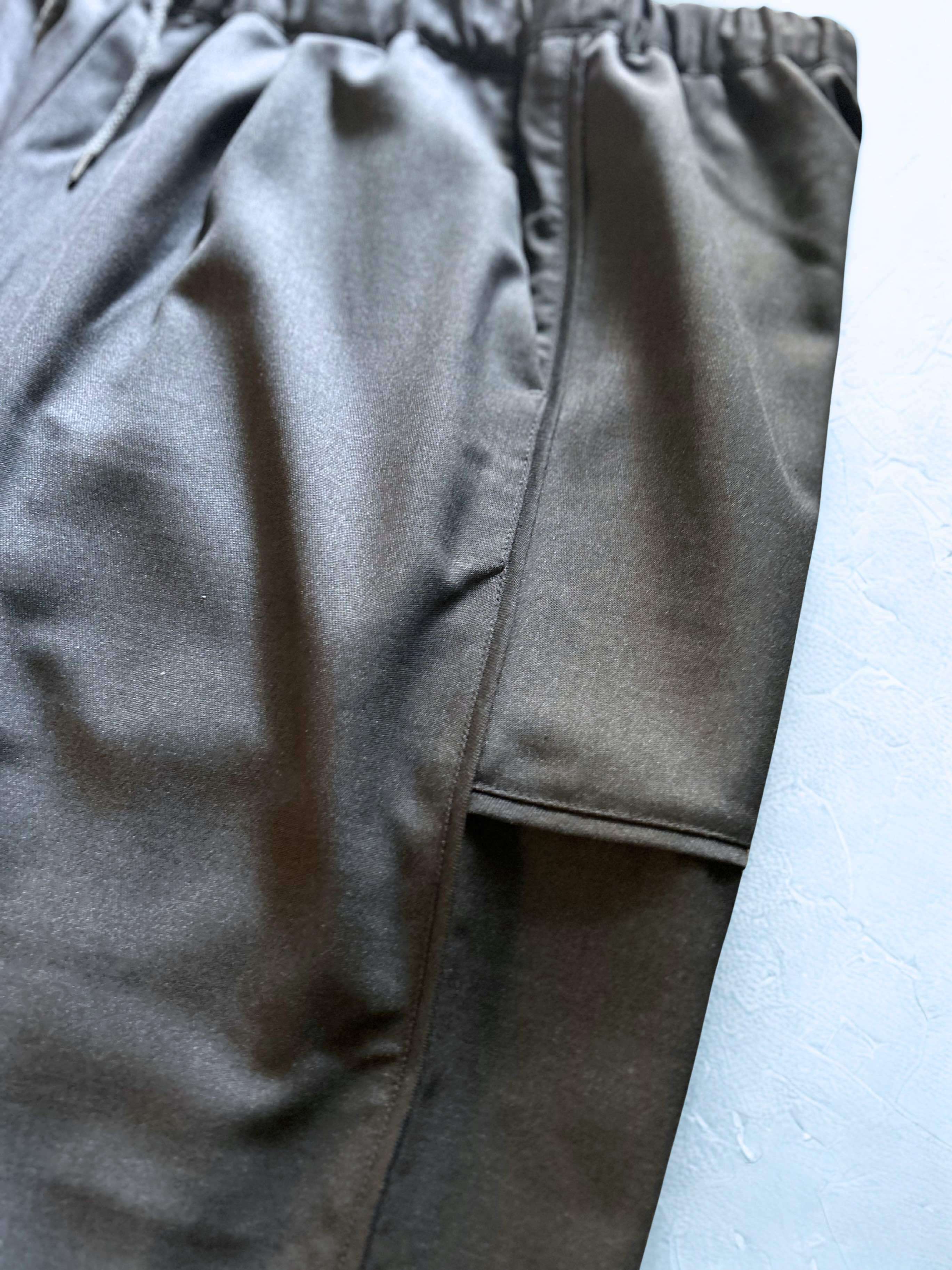 今回のツイルワイドイージーパンツはハイブランドVINTAGEの切り替えをオマージュして素材、シルエットに拘った落ち着きがありながら個性のある一本です。綺麗な斜め畝のカルぜ調ツイルと素材はポリエステル62%ウール21%レーヨン17%で強度もありながらドレープ感が綺麗な見え方です。サイドと腿裏のパイピング切り替えが特徴的でシルエットを整えます。