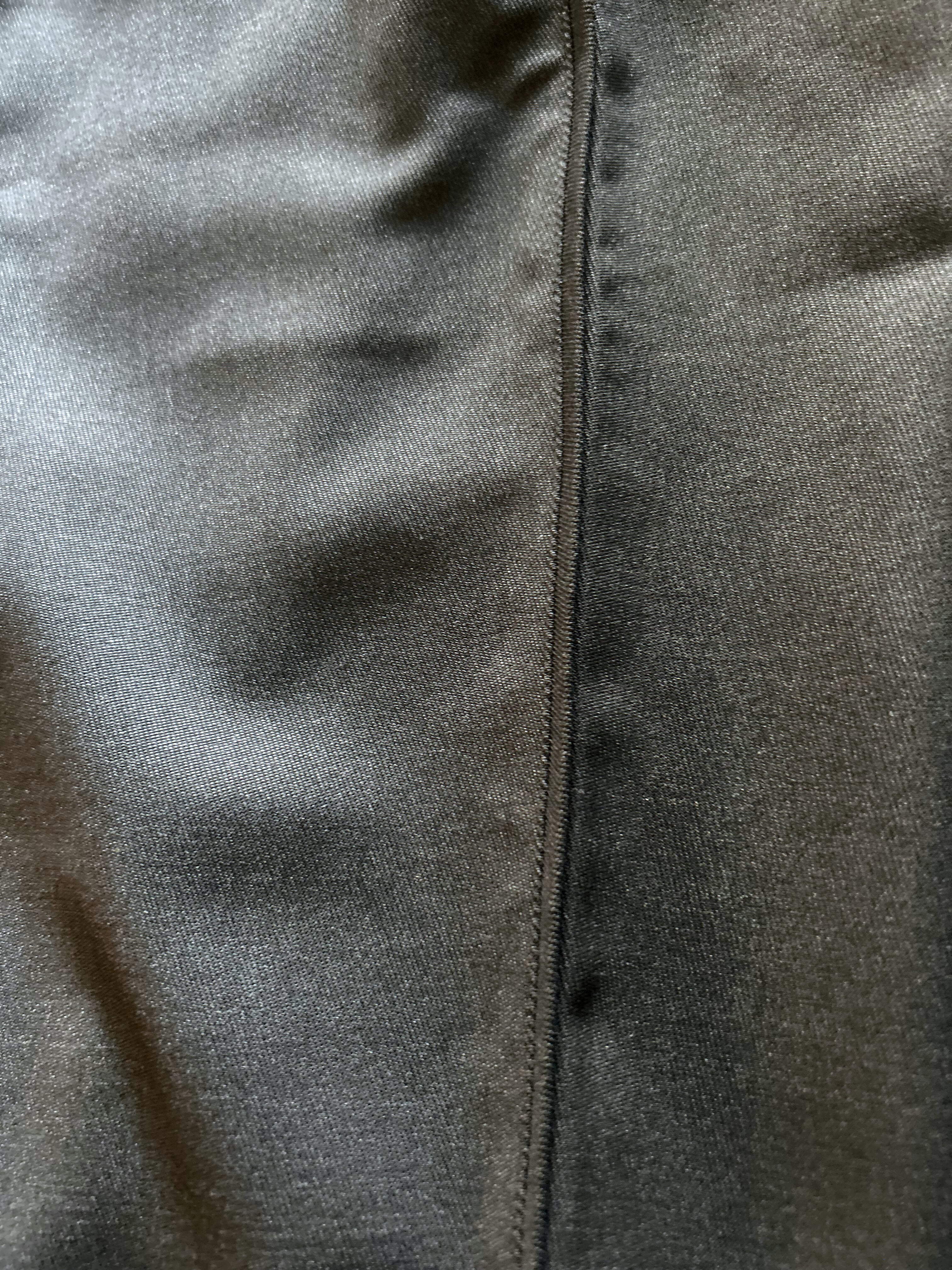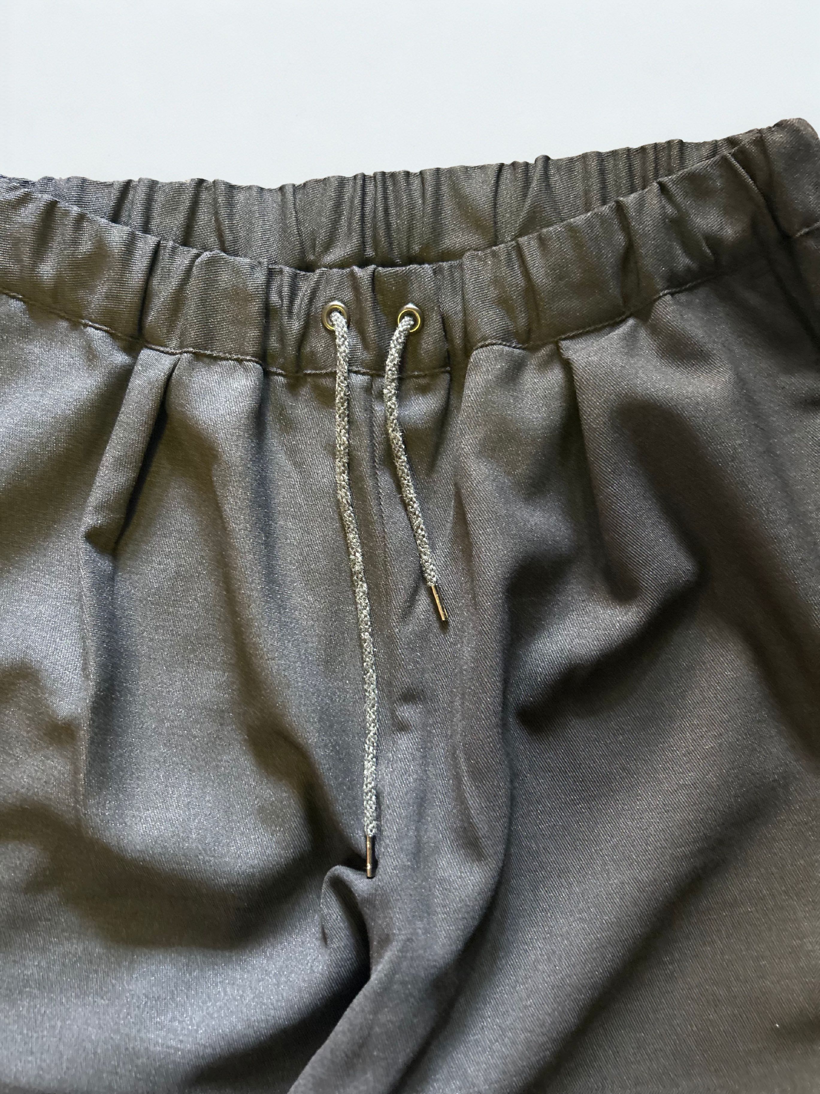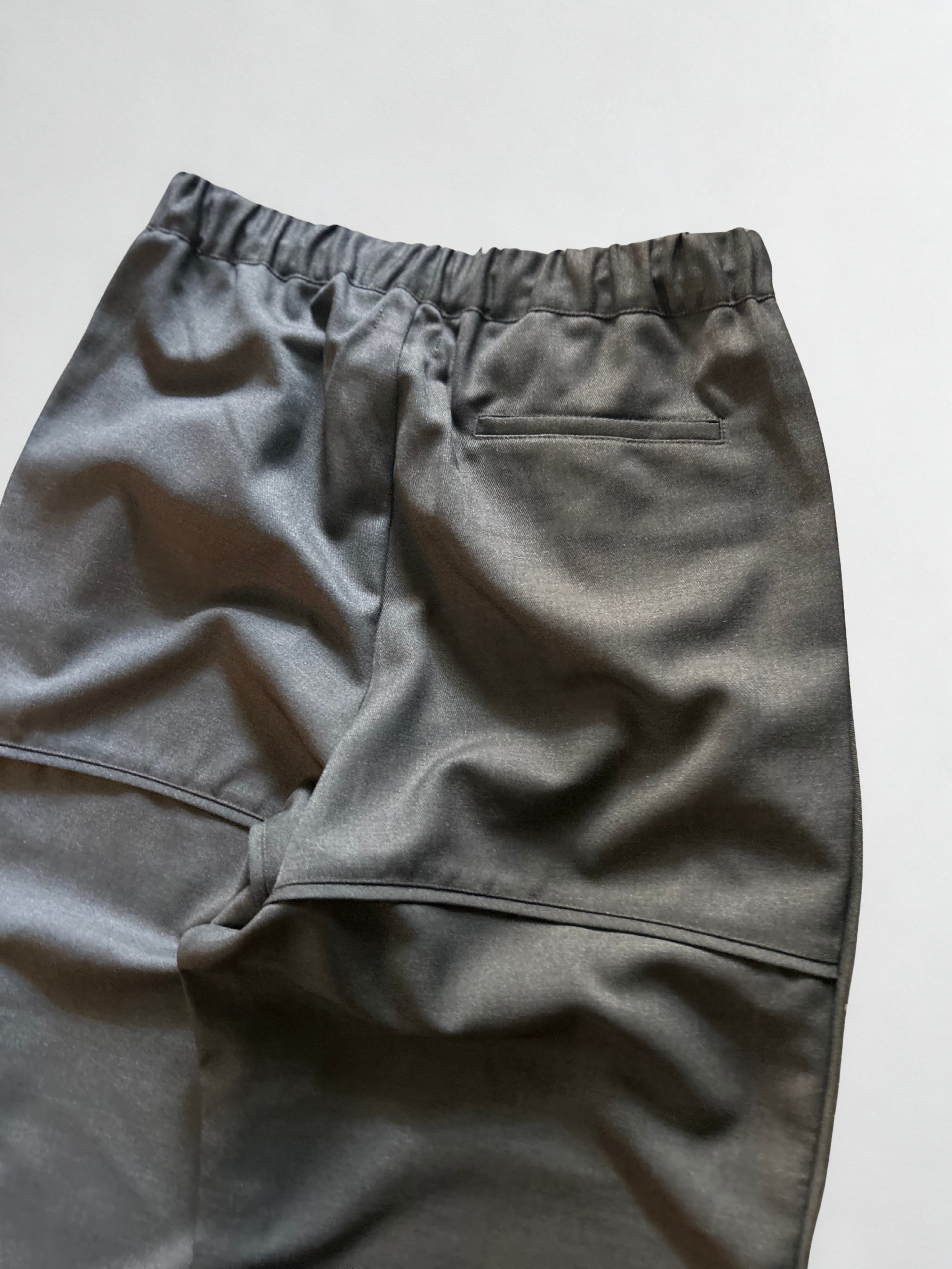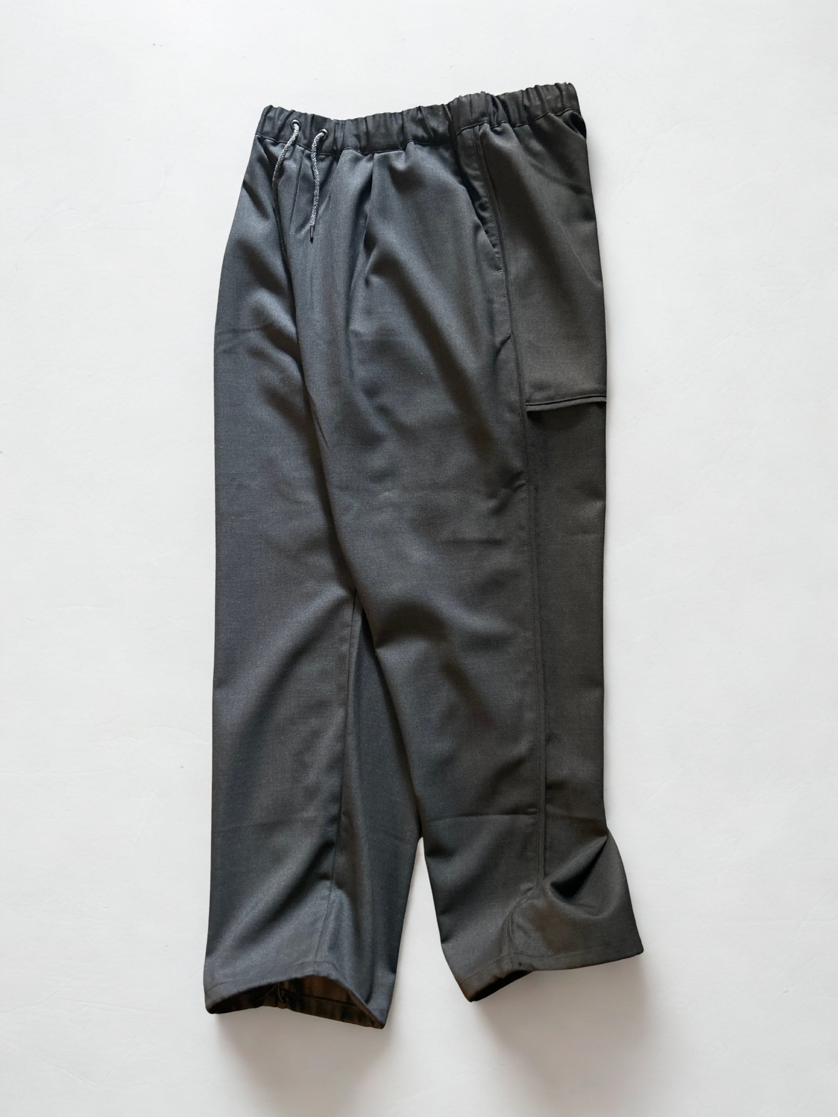 今回のツイルワイドイージーパンツはハイブランドVINTAGEの切り替えをオマージュして素材、シルエットに拘った落ち着きがありながら個性のある一本です。綺麗な斜め畝のカルぜ調ツイルと素材はポリエステル62%ウール21%レーヨン17%で強度もありながらドレープ感が綺麗な見え方です。サイドと腿裏のパイピング切り替えが特徴的でシルエットを整えます。