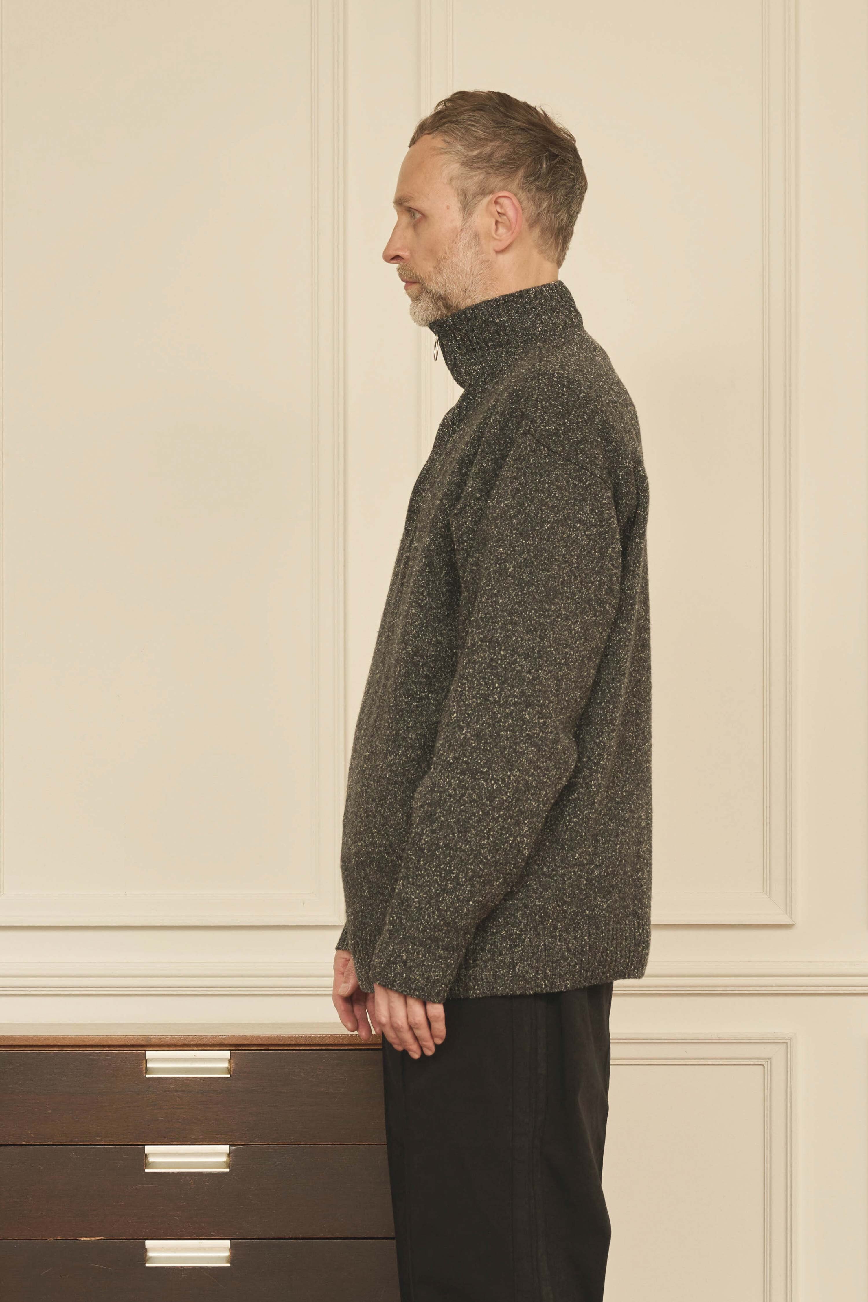 メランジのニットで作成したハーフZIPトップ。