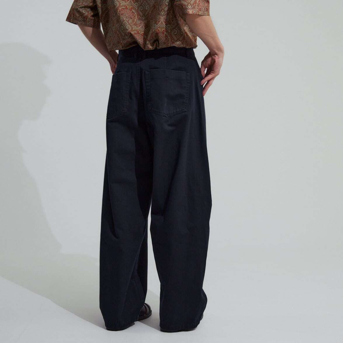 デニム素材なので一見カジュアルですが、程よく落ち感が出る様に生地選びや加工を施しているので、一味違った大人な空気感があります。