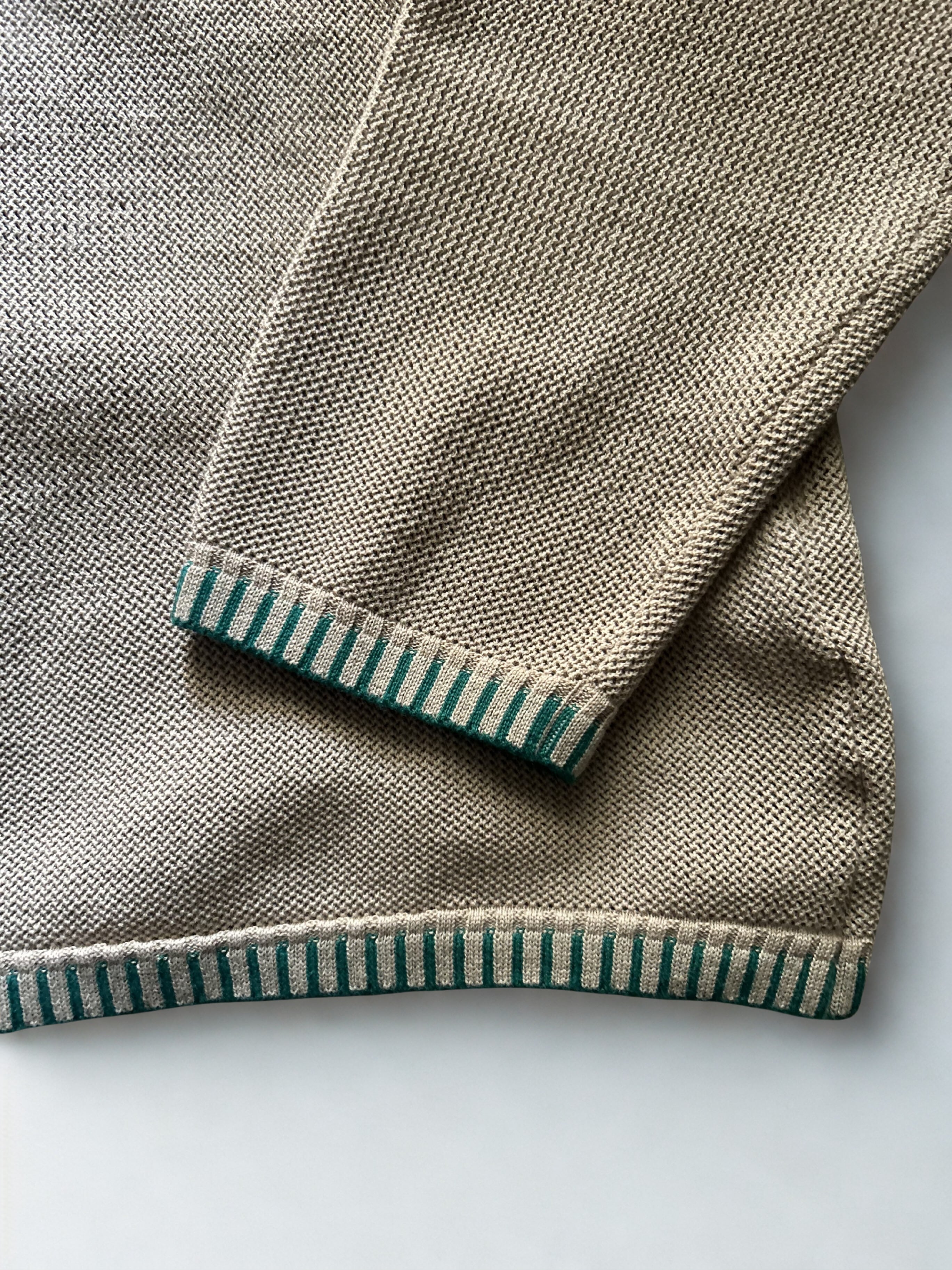 袖口と裾口には、まるでブランケット刺繍のように見える配色編みを施し、ミニマルな中に温もりのあるアクセントをプラス。