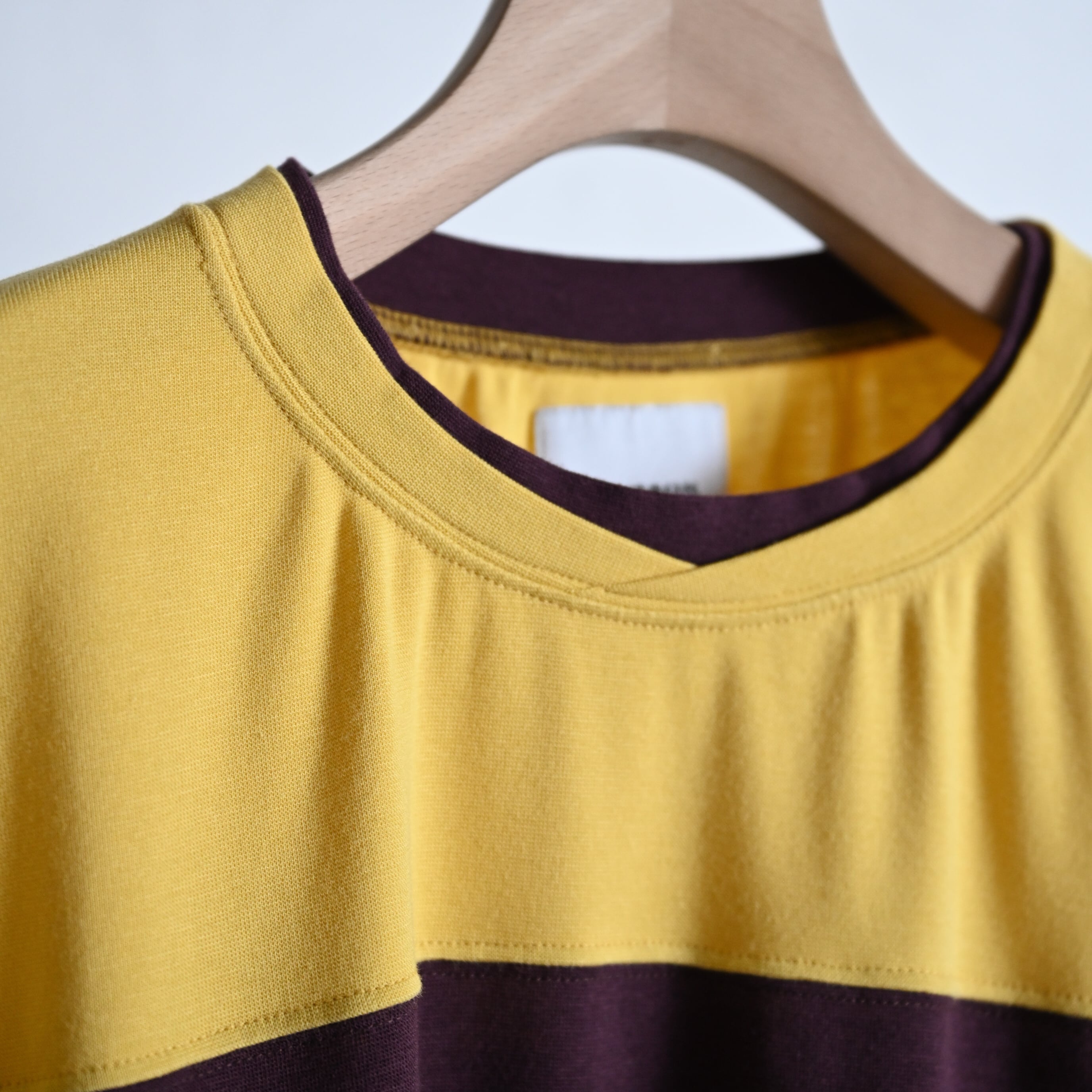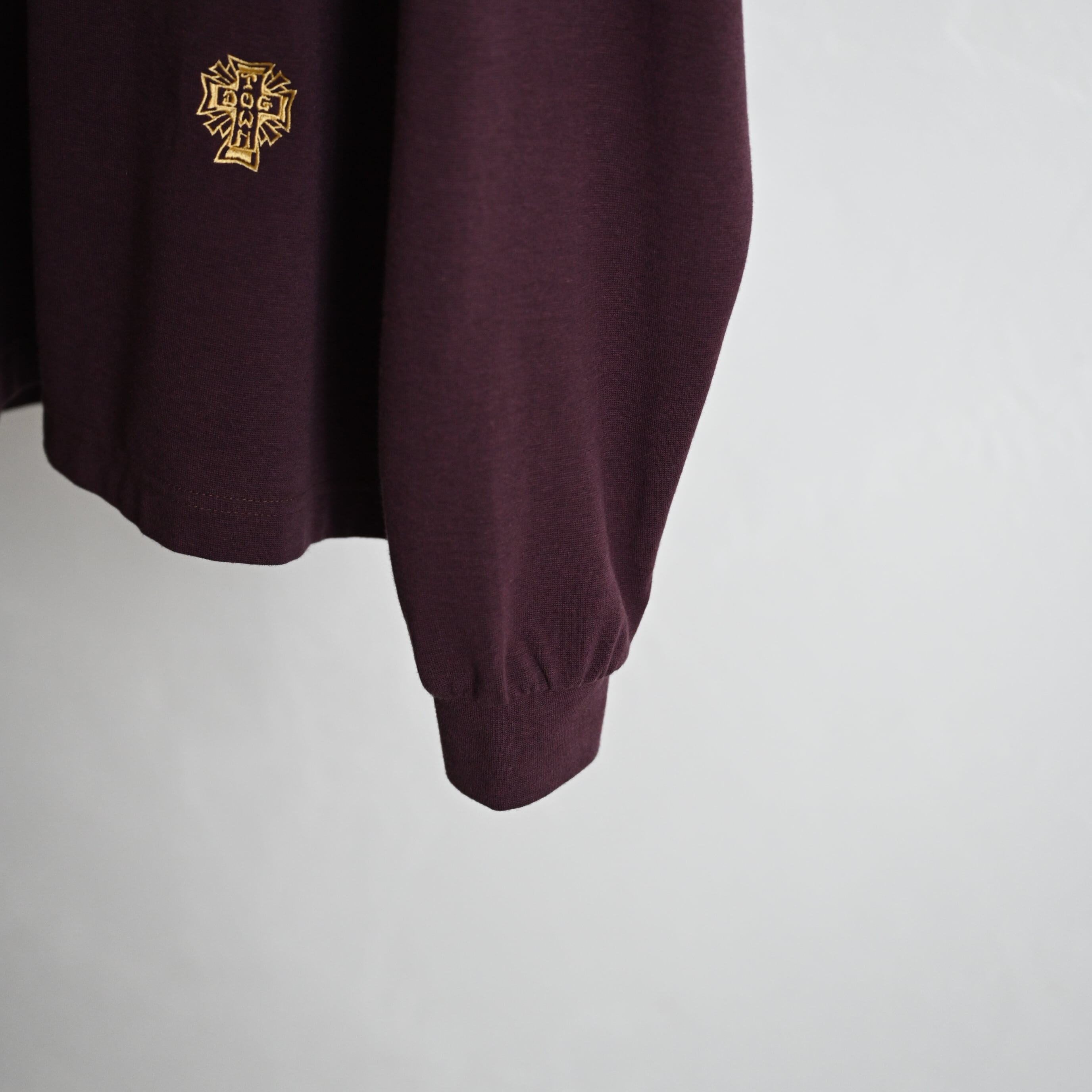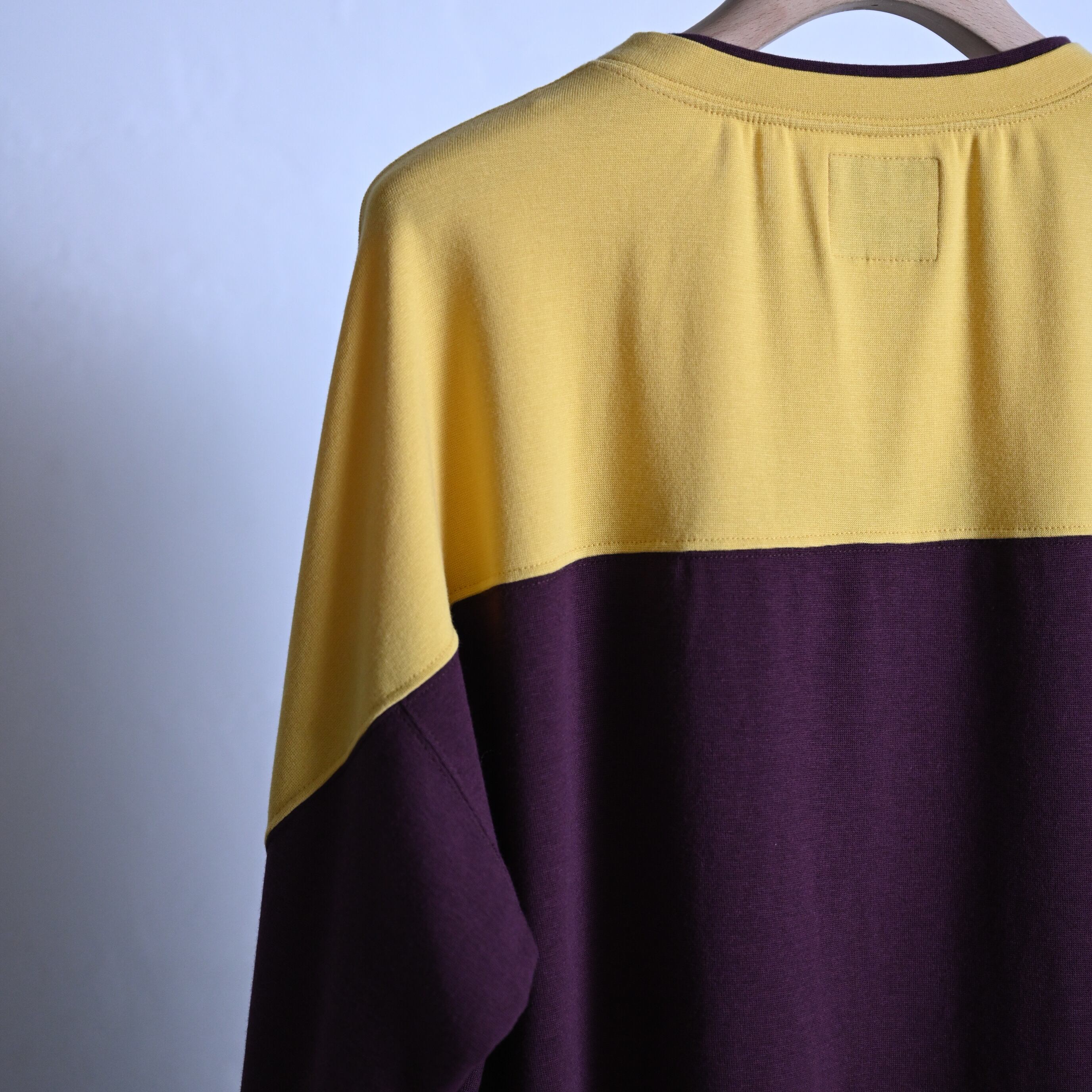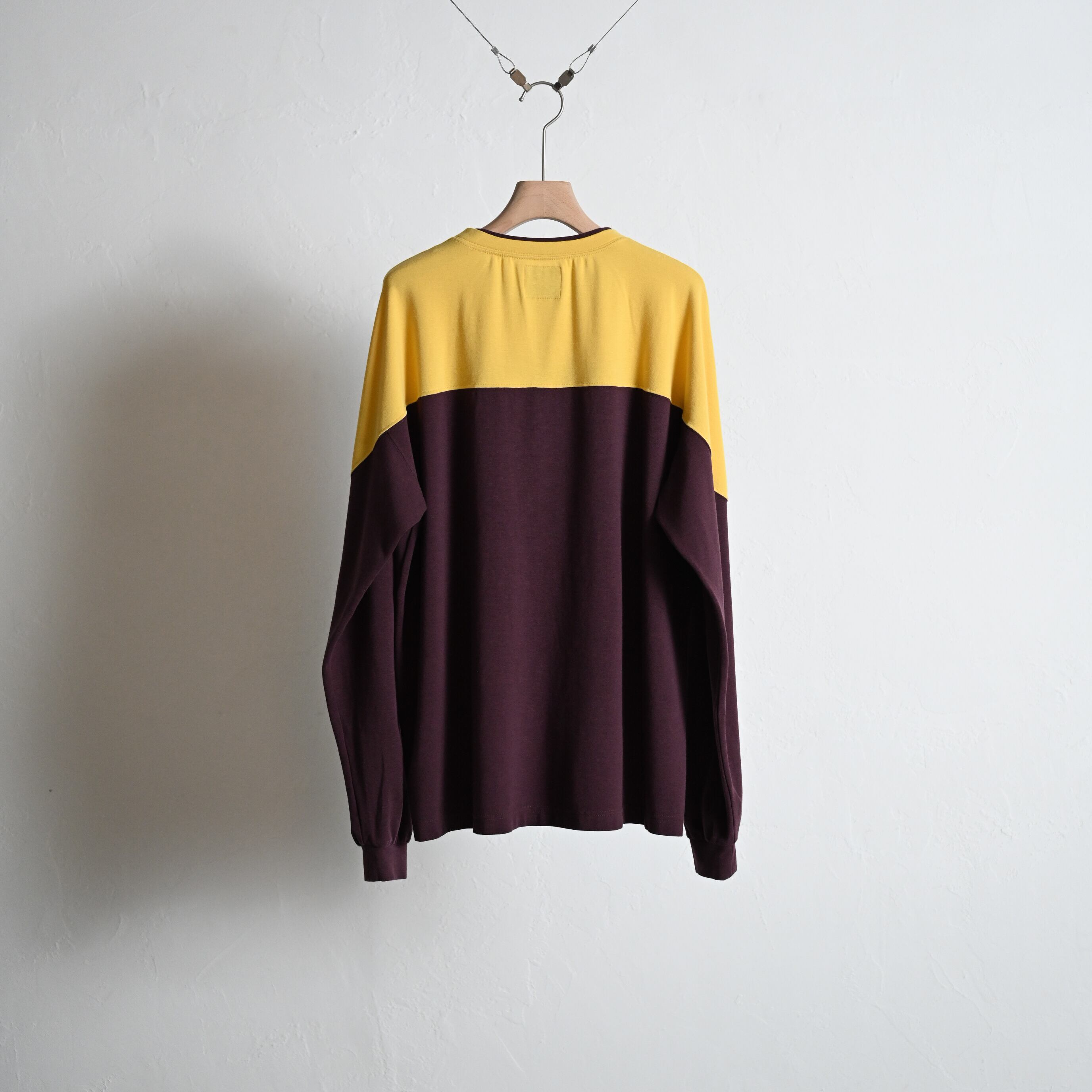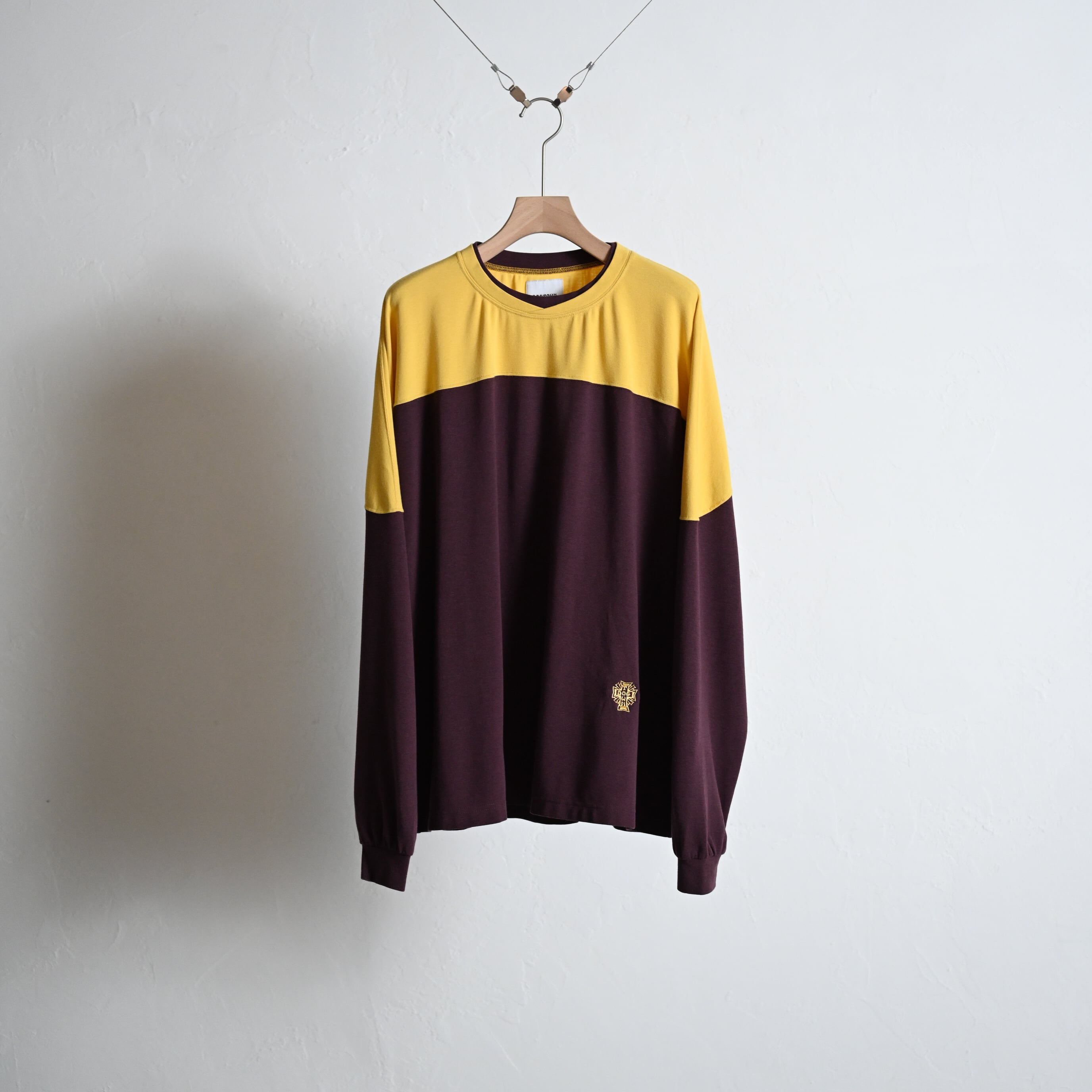 トロミのあるレーヨン、コットンにストレッチを入れた着心地のよりフットボールロングスリーブT。襟元のレイヤー風デザインはVINTAGEのスポーツウェアをイメージしてます。切り替えの配色にもこだわり、レトロなサーフスケートを現代的解釈で落とし込んでます。また、レタークロス刺繍が左脇にさり気ない位置で色合わせDE配置されてます。