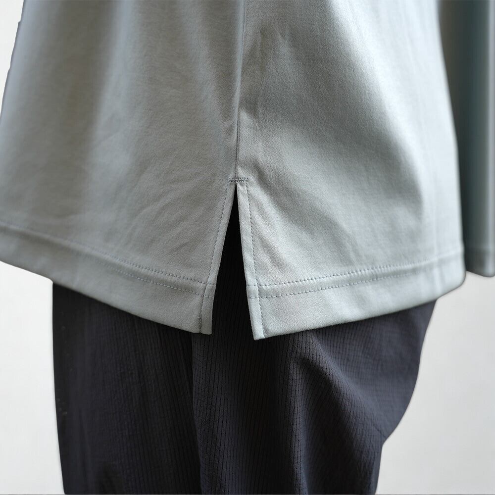 接触冷感性があり、薄地で快適ながらもハリコシがあるスーピマコンパクト糸のスムース生地を使用しているので透け感を気にせずに着用頂けます。