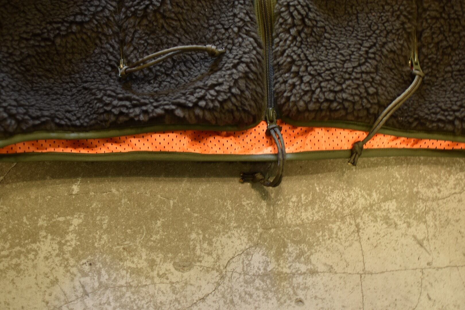 スタンドカラーのシープフリースジャケットです。70’S〜80’初期をイメージしたかなり深めな前下りが特徴的なスタンドカラー。綺麗なシルエットの楽ランスリーブでアームホールをたっぷりとり、ゆったりとしています。