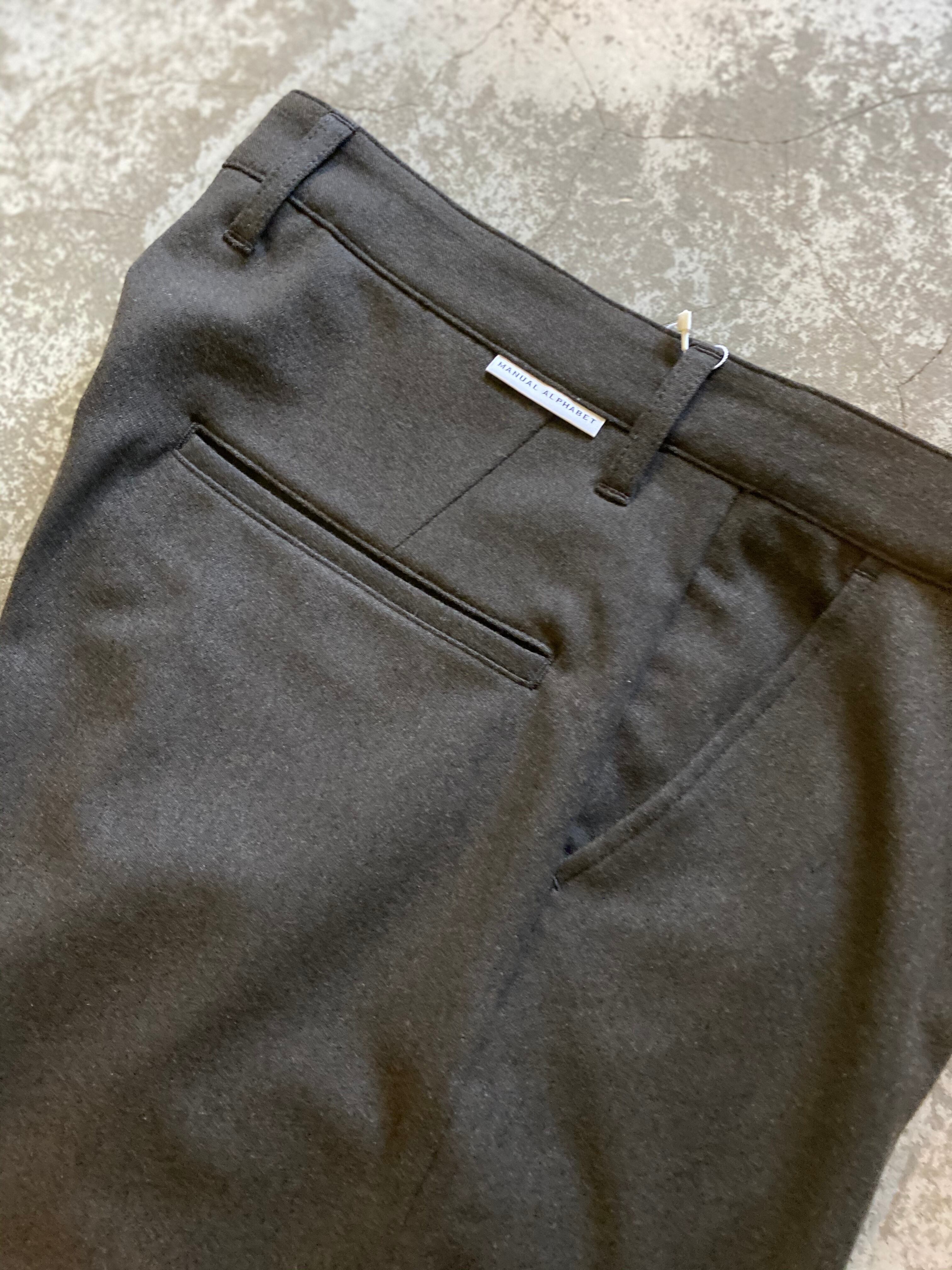 両面起毛のT/R素材を使用したストレートシルエットのトラウザーパンツ。 滑らかな素材を生かした美しいシルエットが特徴です。スレキにはトレンドを意識し、カーキの へリンボンスレキを使用し、ミリタリーの要素をプラスしています。