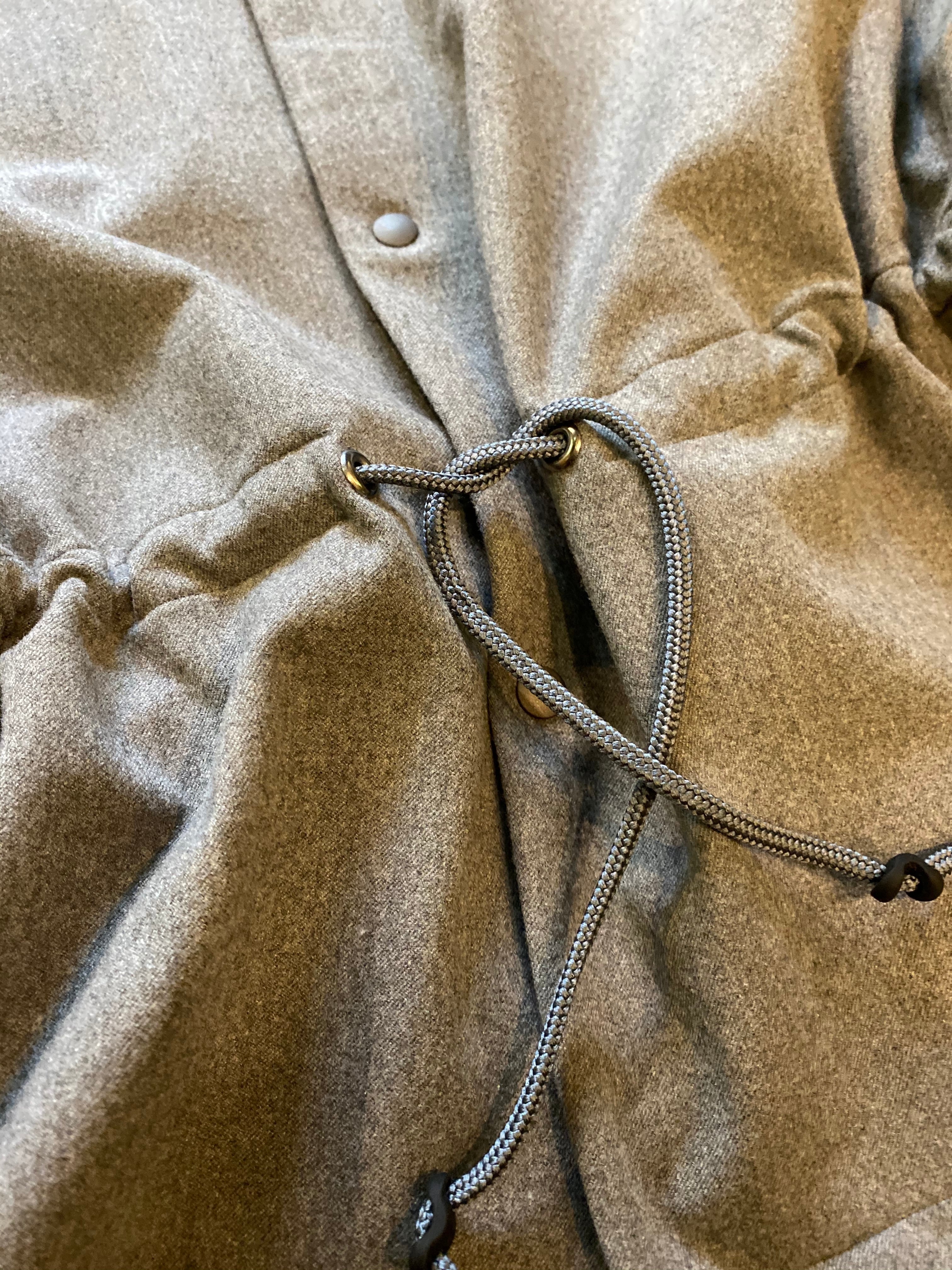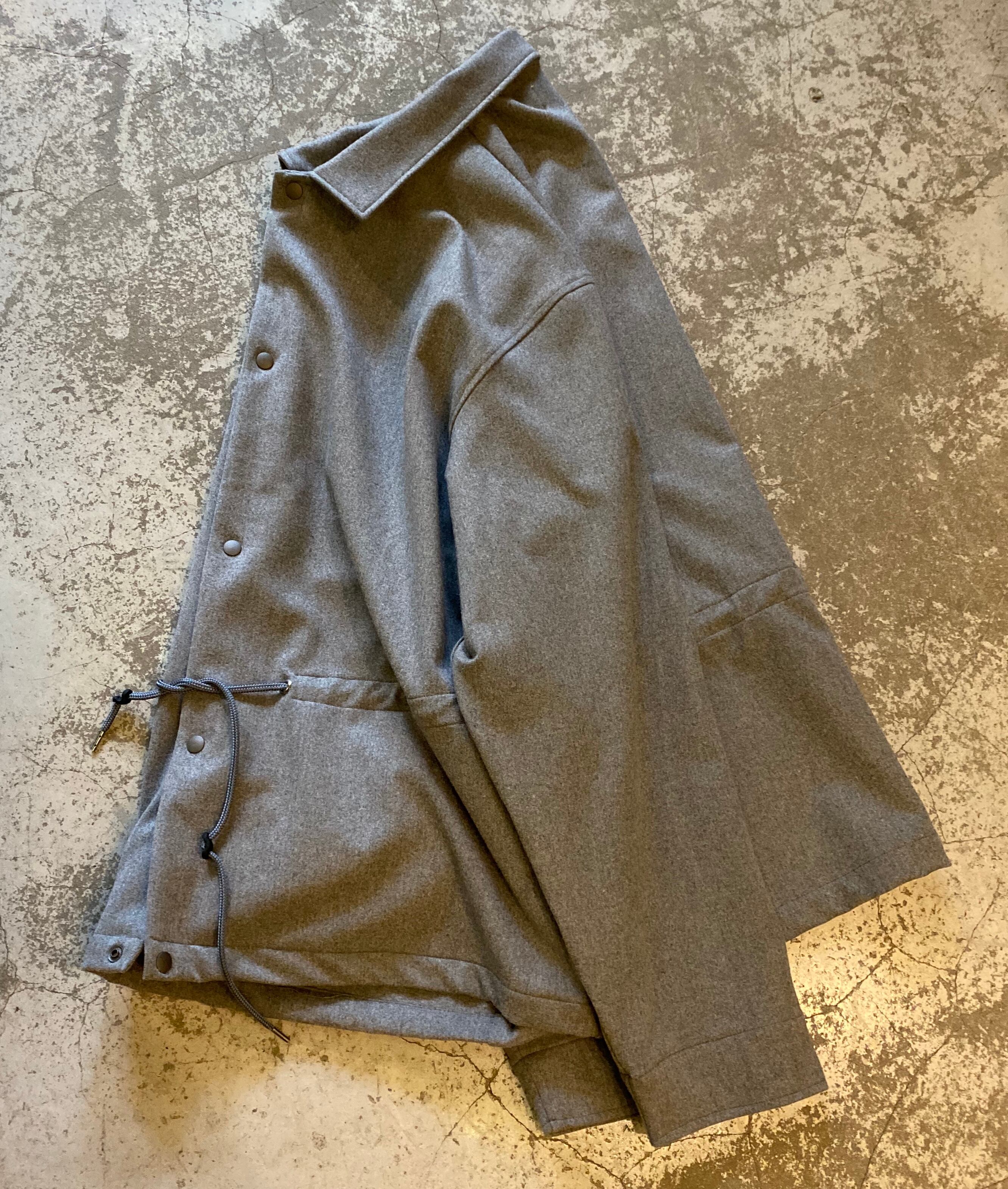 両面起毛のT/R素材を使用した落ち着きのあるコーチジャケット。 身幅・アームホールともにゆとりのあるシルエットと肌馴染みのよい素材感が特徴です。 ウエストにはスピンドルを通しているので、シルエットをアレンジすることも可能です。ボトムと合わせたSET UPスタイルもあります。