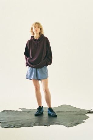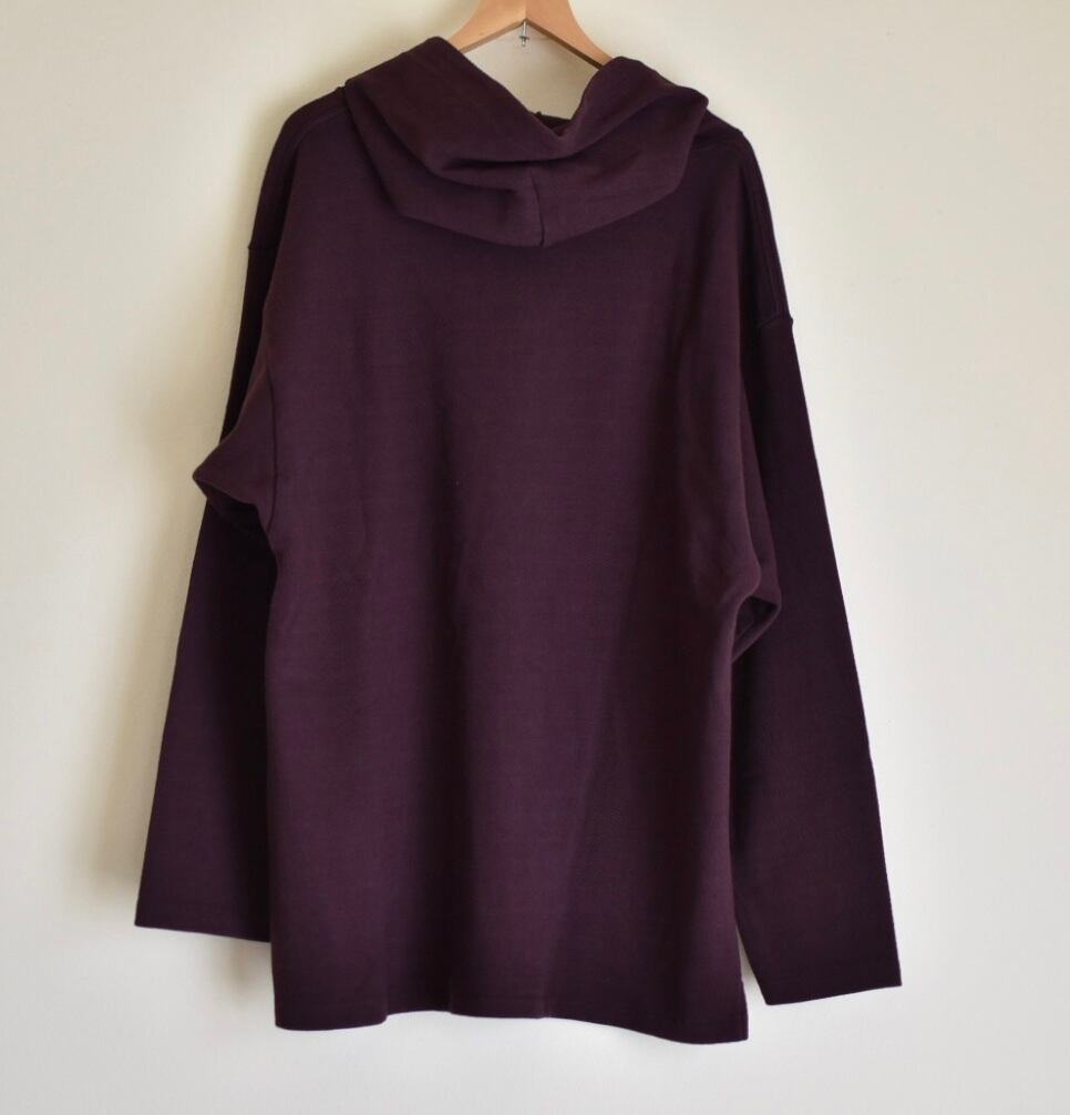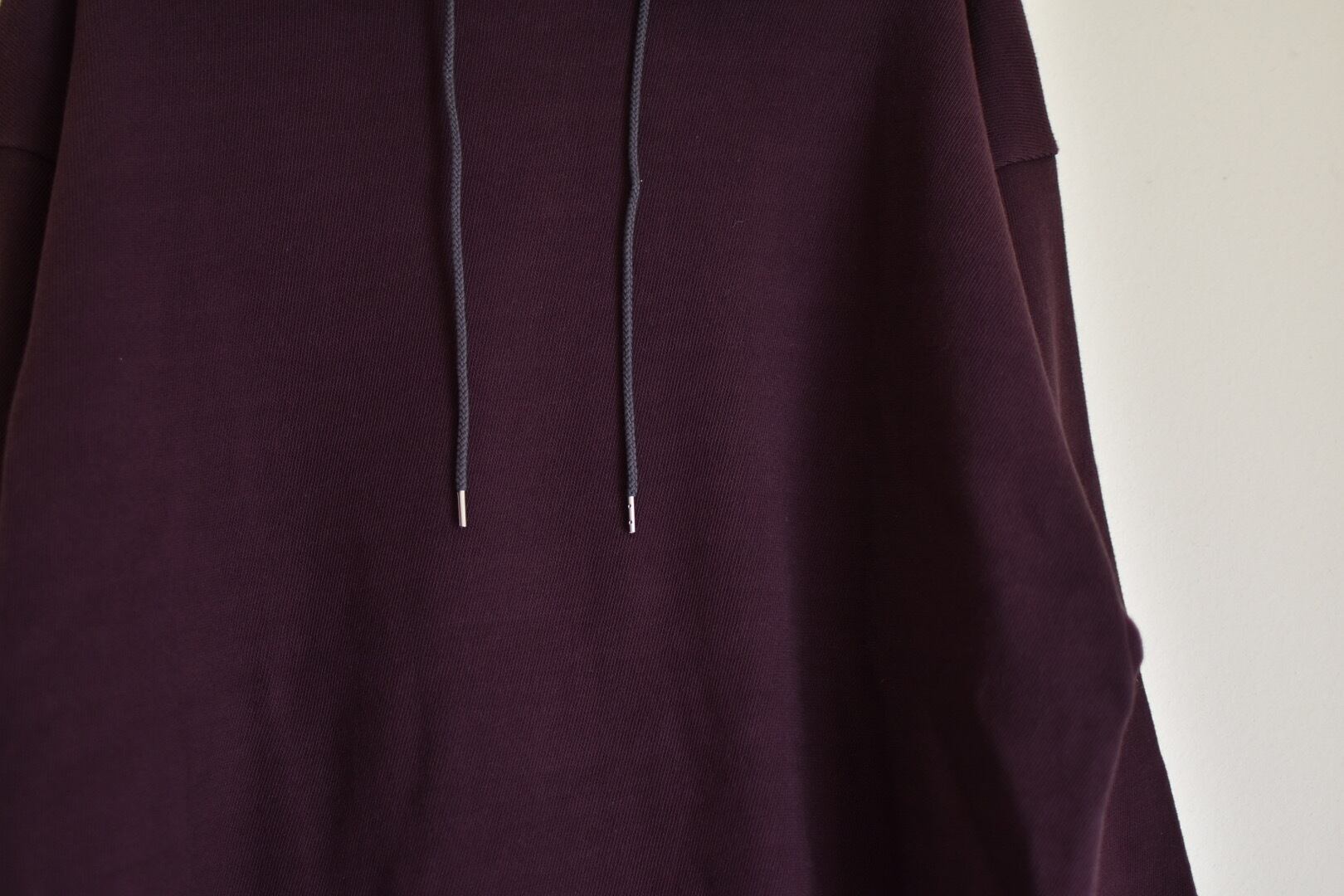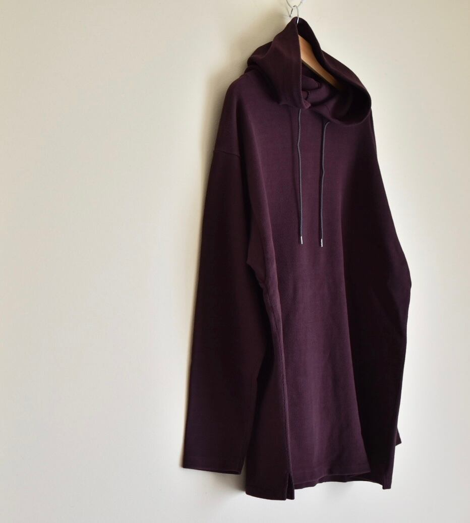 ルーズでリラックス感のあるシルエットの中にラグジュアリーな匂いのあるフードパーカー。太番手の糸にうねりを出して編んだ生地はサラッとした質感と程よい重みのあるニットの様、斜めに綾織の表情が出たカルゼの様な見た目です。袖や裾にリブを設けてないのでアウターとしてもインナーとしても活躍できます。