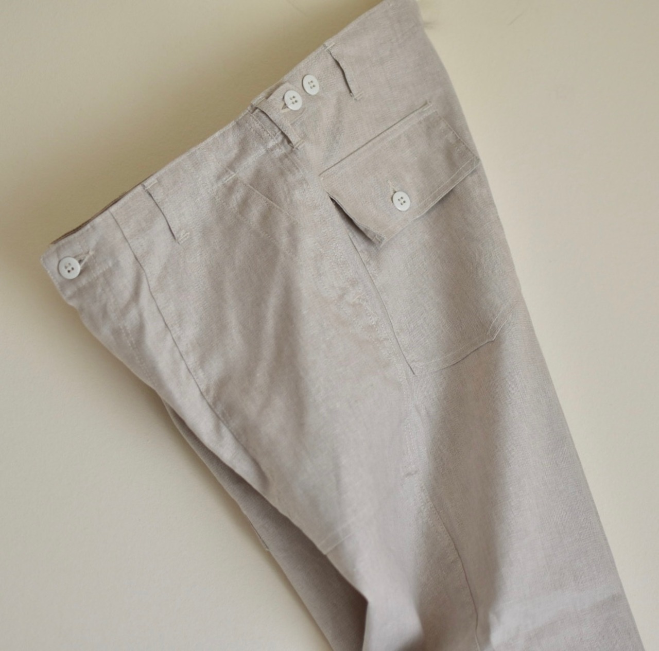 60年代から70年代の米軍・ユーティリティトラウザーズを複数使い、その時々の気分で細かい調整を加えながら独自に発展させてきた形です。