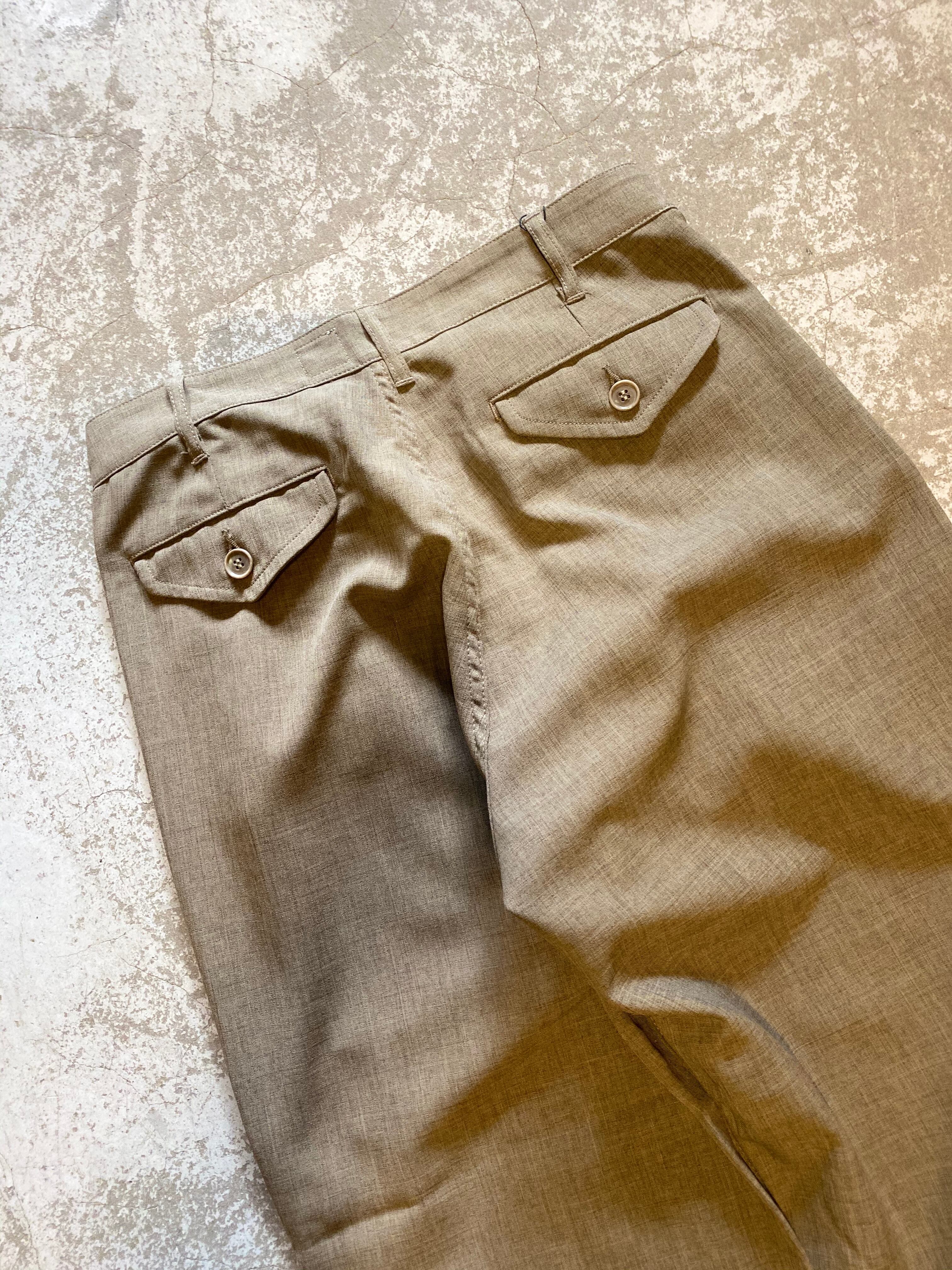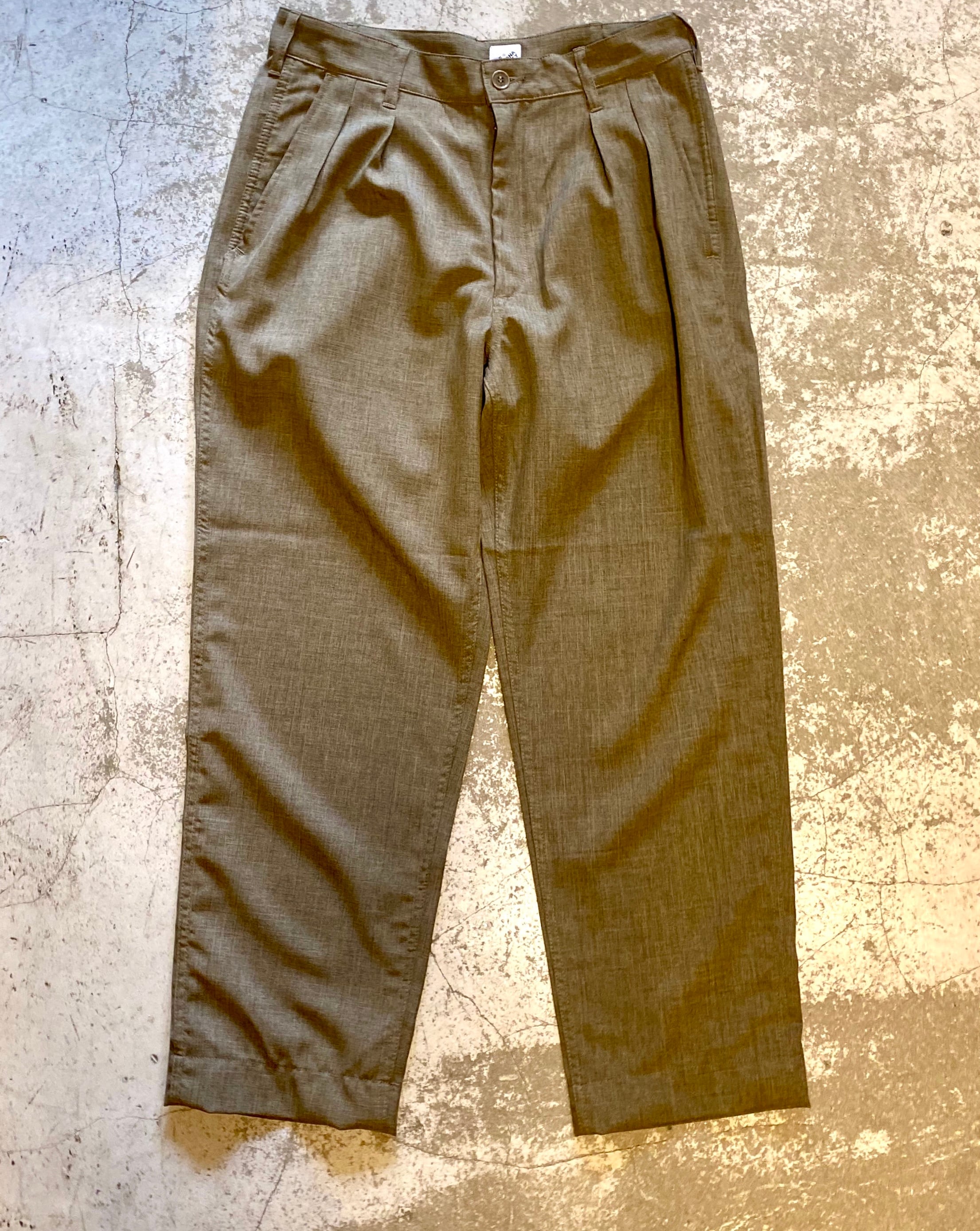 US ARMY 2タック・チノトラウザーを参考に製作された形で、フロント2タックの太いワタリから真っすぐ裾に向けてテーパードするシルエットが特徴です。FATIGUE SLACKS シリーズの新定番で、スラックスのように穿けるパンツです。今回は、素材に “ESTER TROPICAL CLOTH”を使用。ウールトロピカルクロスをポリエステルで表現した生地で、上質な雰囲気とポリエステルならではの扱いしやすさを兼ね備ています。ウーステッド・ウール(サマー・ウーステッド)のようなサラサラっとしてドライな質感の生地は、春から夏にぴったり。シャツやTシャツを合わせるだけでも、雰囲気のあるコーディネートが楽しめます。