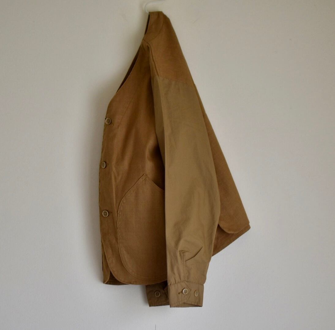ハンティングベストに袖が付いたイメージのジャケットで、袖と身頃が別素材で切り返されています。