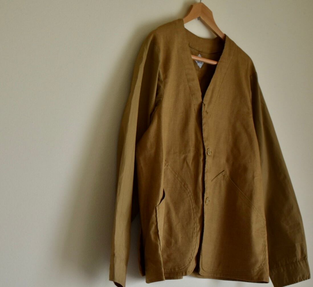 大きめのポケット類が使いやすいカラーレス(襟無し)ハンティングジャケット。