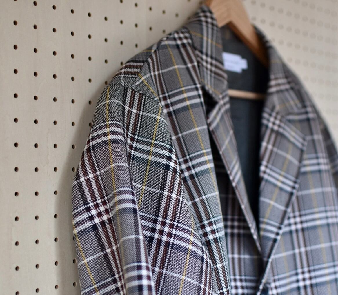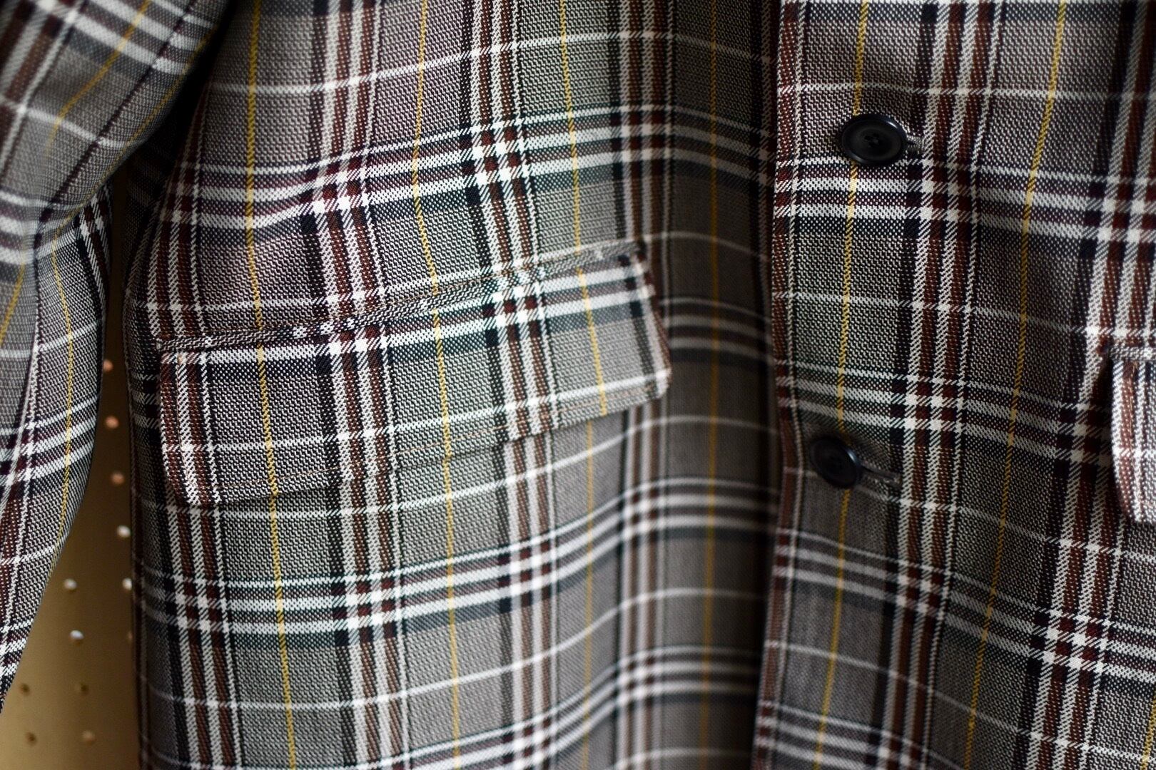 ドロップショルダーでたっぷりした身幅のチェスターコート。広めのアームホールから袖口までのたっぷりしたラインも特徴的です。オーセンティックなチェックですが高密度のウール50%、ポリエステル50%のシャリ感のある生地。温かみの中に都会的な印象を与えてくてます。裏地には保温性の高いネルで隙のない気配りされてます。
