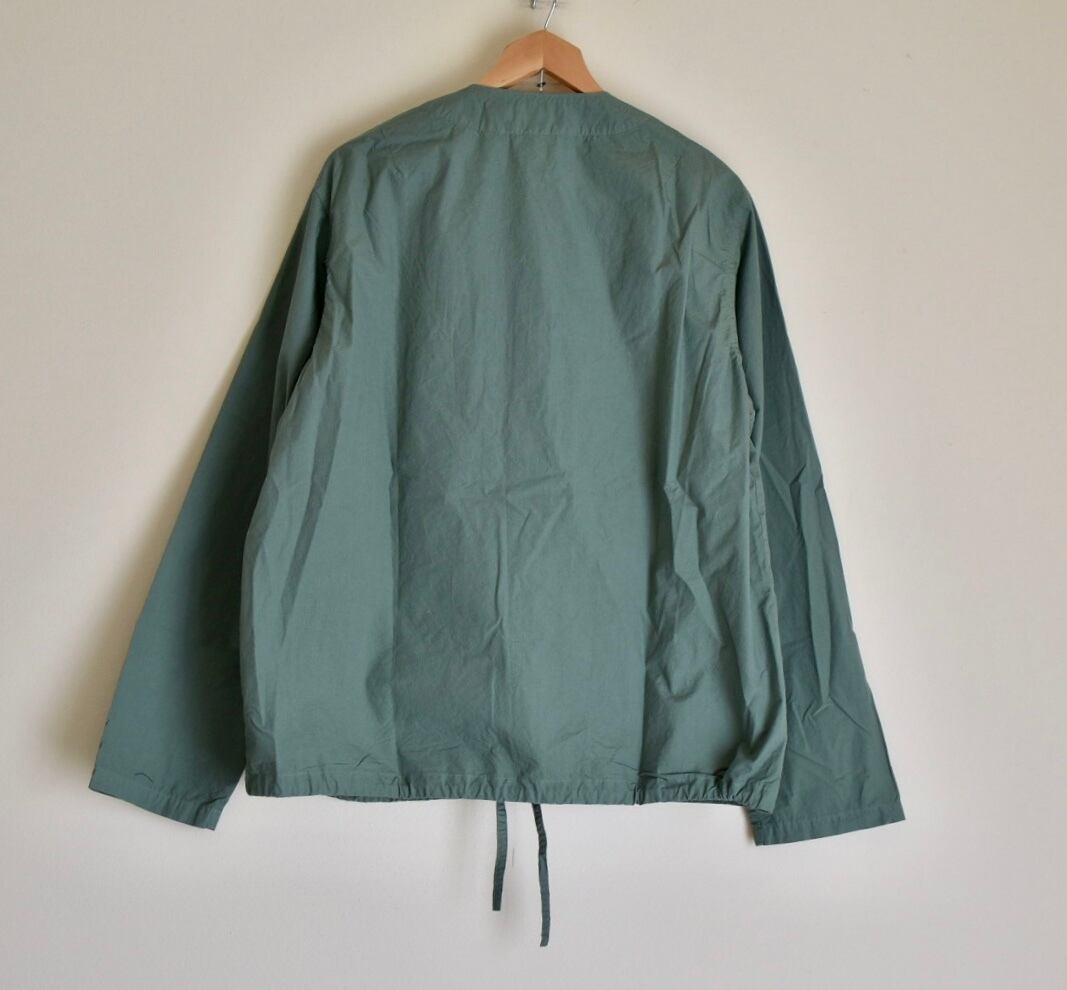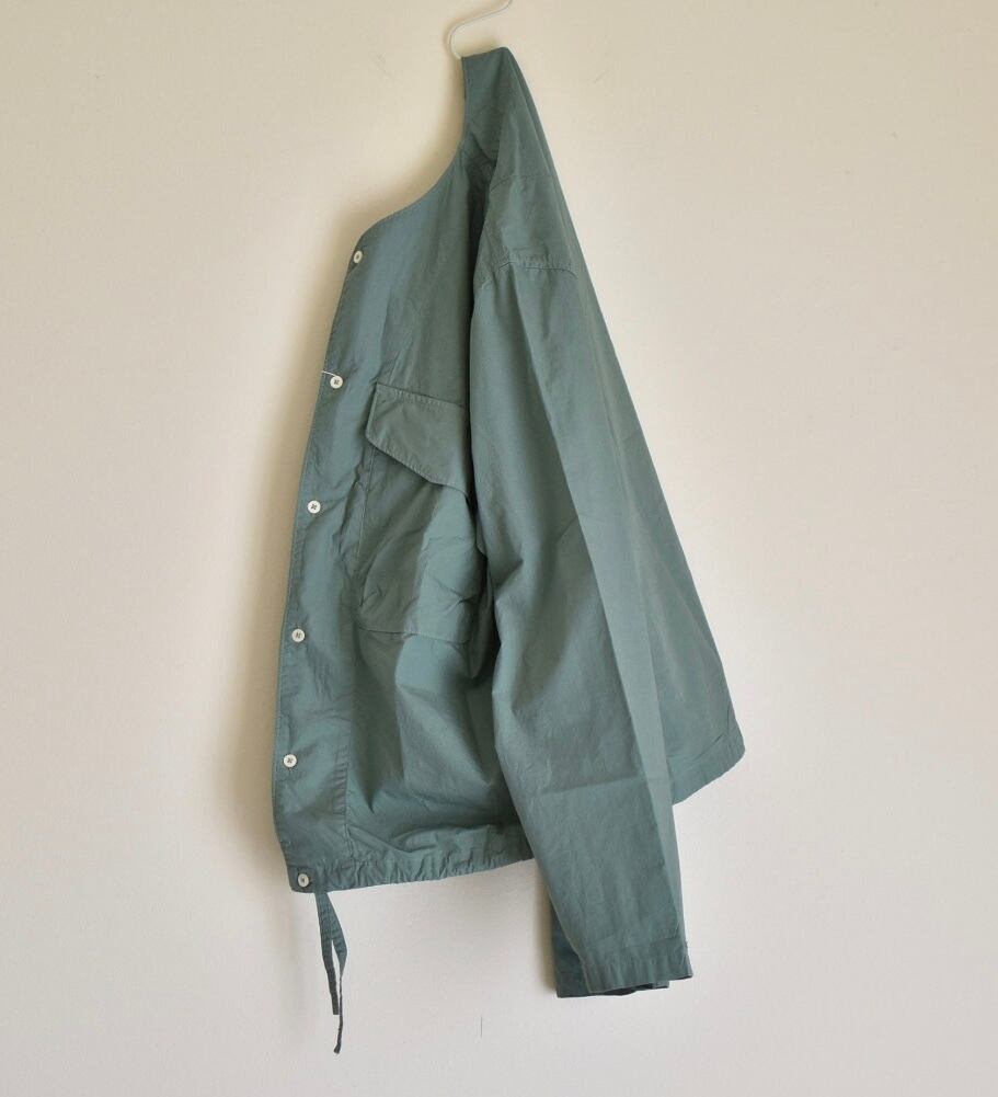 50タイプライターの製品染めノーカラーシャツ。裾のスピンドルと、大きめのカーゴ ポケットを大胆に胸に配したデザインが特徴です。軽く膨らみのある素材を特性を生か し、リラックスしたシルエットに仕上げています。2次加工でシリコンを染み込ませ、 独特の張りと細かなシワを抑える加工をプラス。滑るようなタッチ感が特徴です。