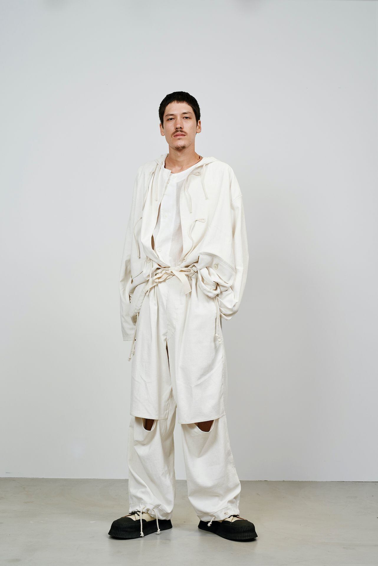 タッチはポリエステルだが見え方がコットンのような麻のカスが入った機能系オックス素材。イタリア軍のスノーパーカーから着想を得た程良くオーバーサイズのパーカー