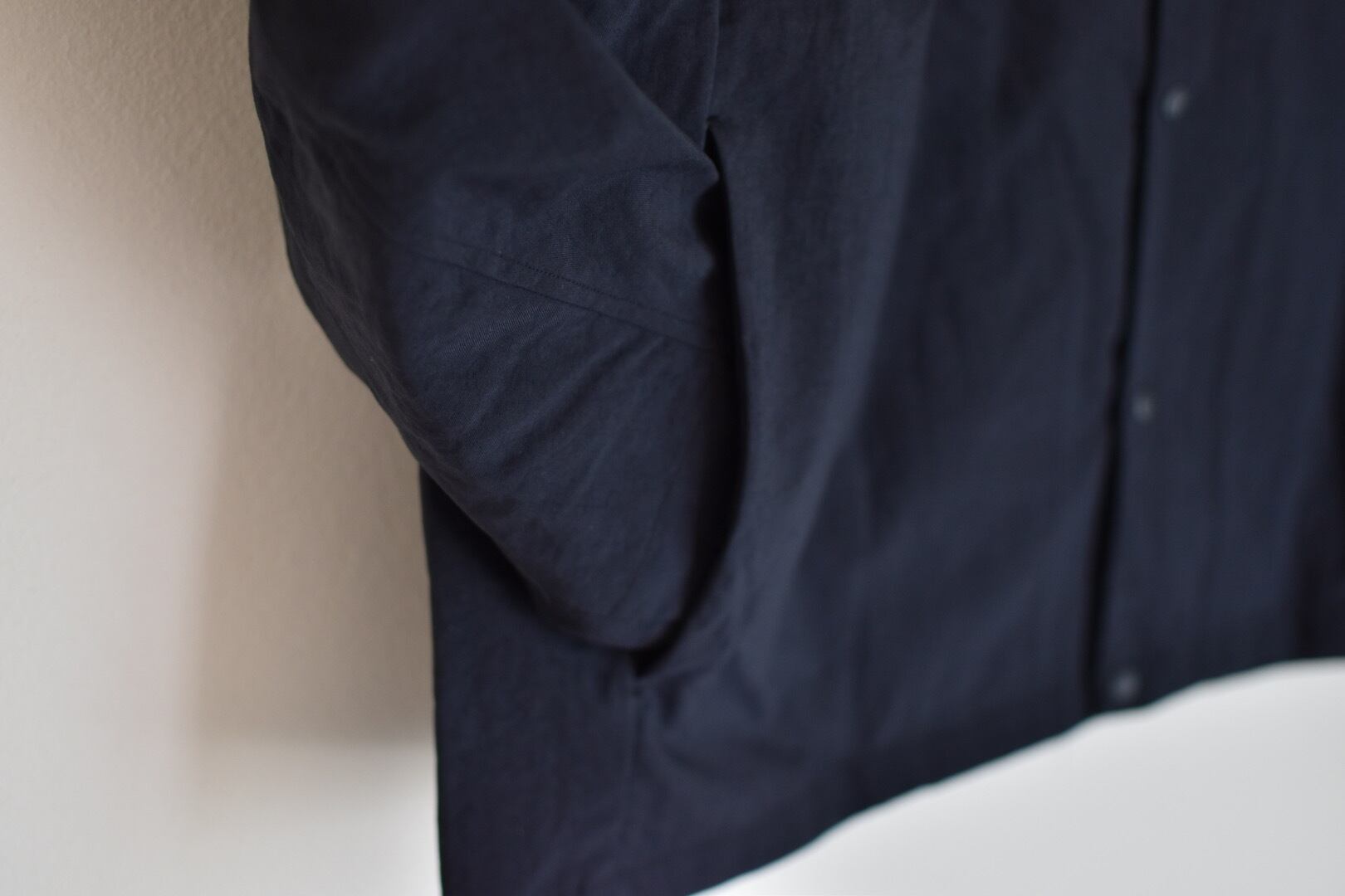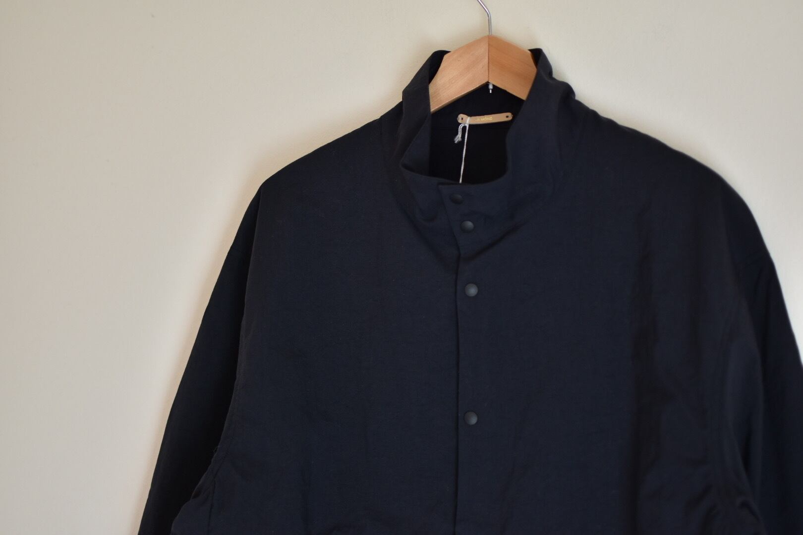 首周りが特徴のスタンドカラーコーチジャケットです。シボ感のあるナチュラルな印象のナイロンを天然染料で染め独特な表情出してます。軽量でスラッシュポケットも配置されたミニマルナデザインながら着心地を考慮してます。
