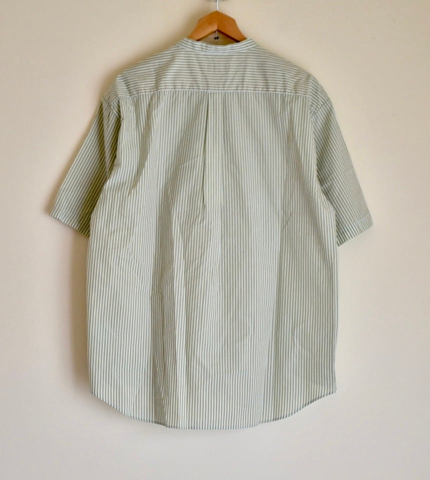 50ブロードのストライプを製品染めしたバンドカラーのLOOSE FITシャツ。 先染めのストライプに加えてさらに後染めすることにより、他にはないスペシャルなカラーに仕 上がりました。