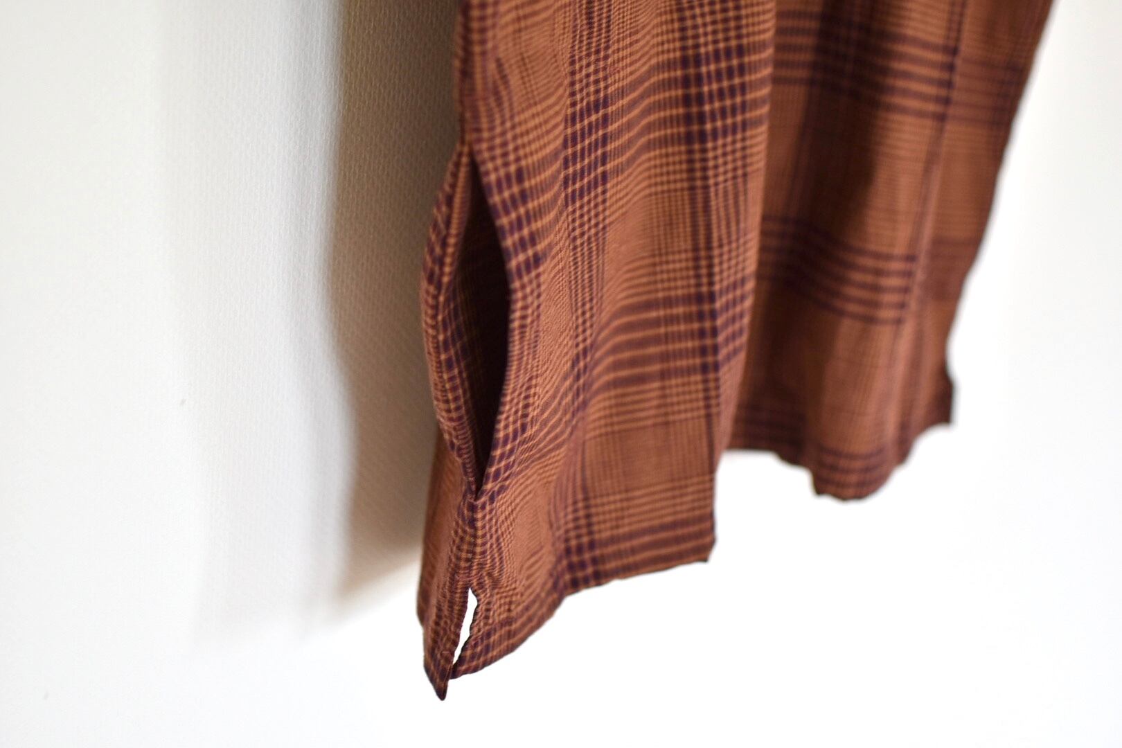 レーヨン/ポリ/リネンのクラシックチェックの半袖ワークシャツ。 ゆとりのあるボックスシルエットと、変形のフラップ付きの胸ポケット、さらに腰のシームポ ケットでワークシャツの雰囲気と機能性を表現しています。