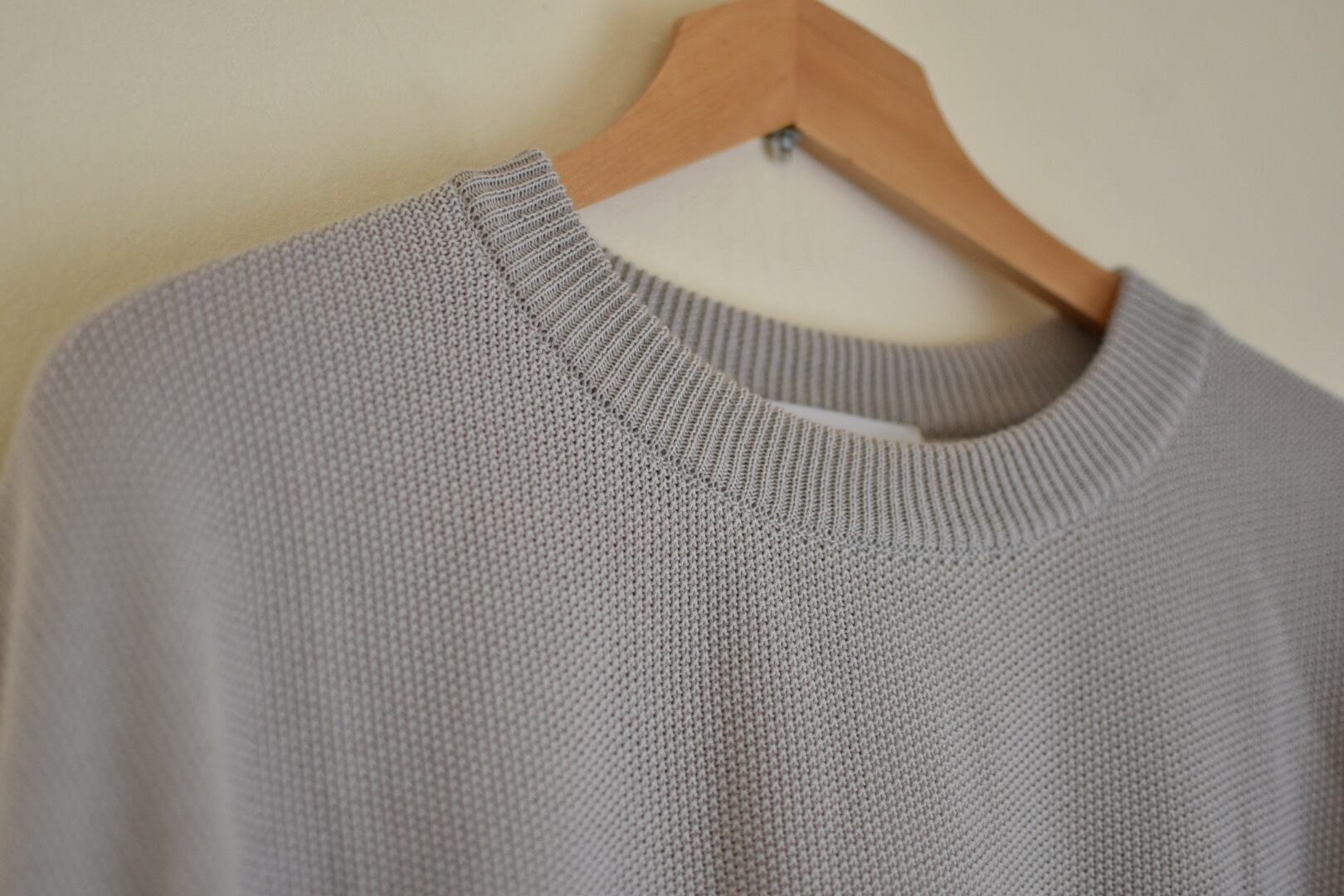 100/2の強撚コンパクト糸で通気性の良い鹿の子織に仕上げたクルーネックニット