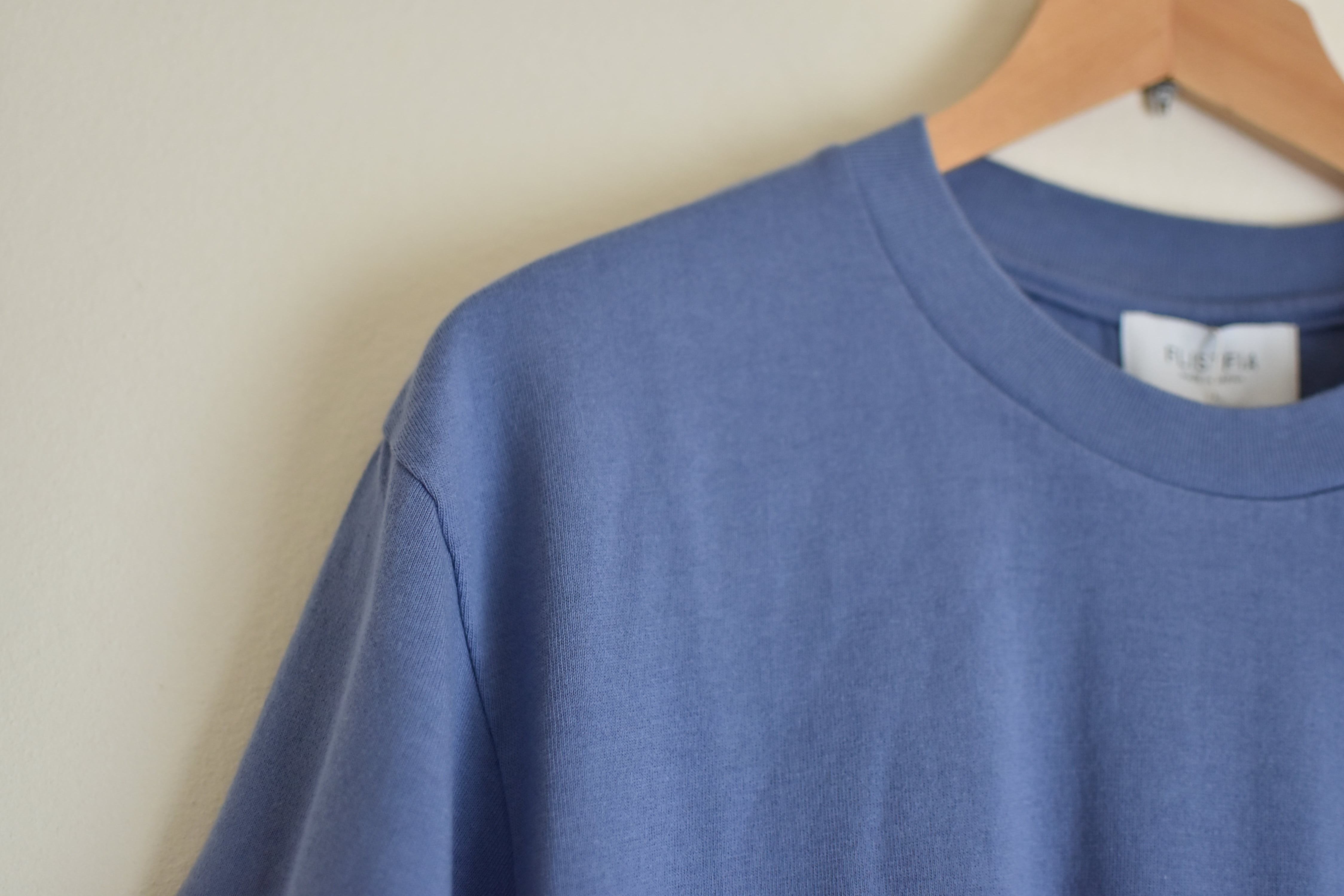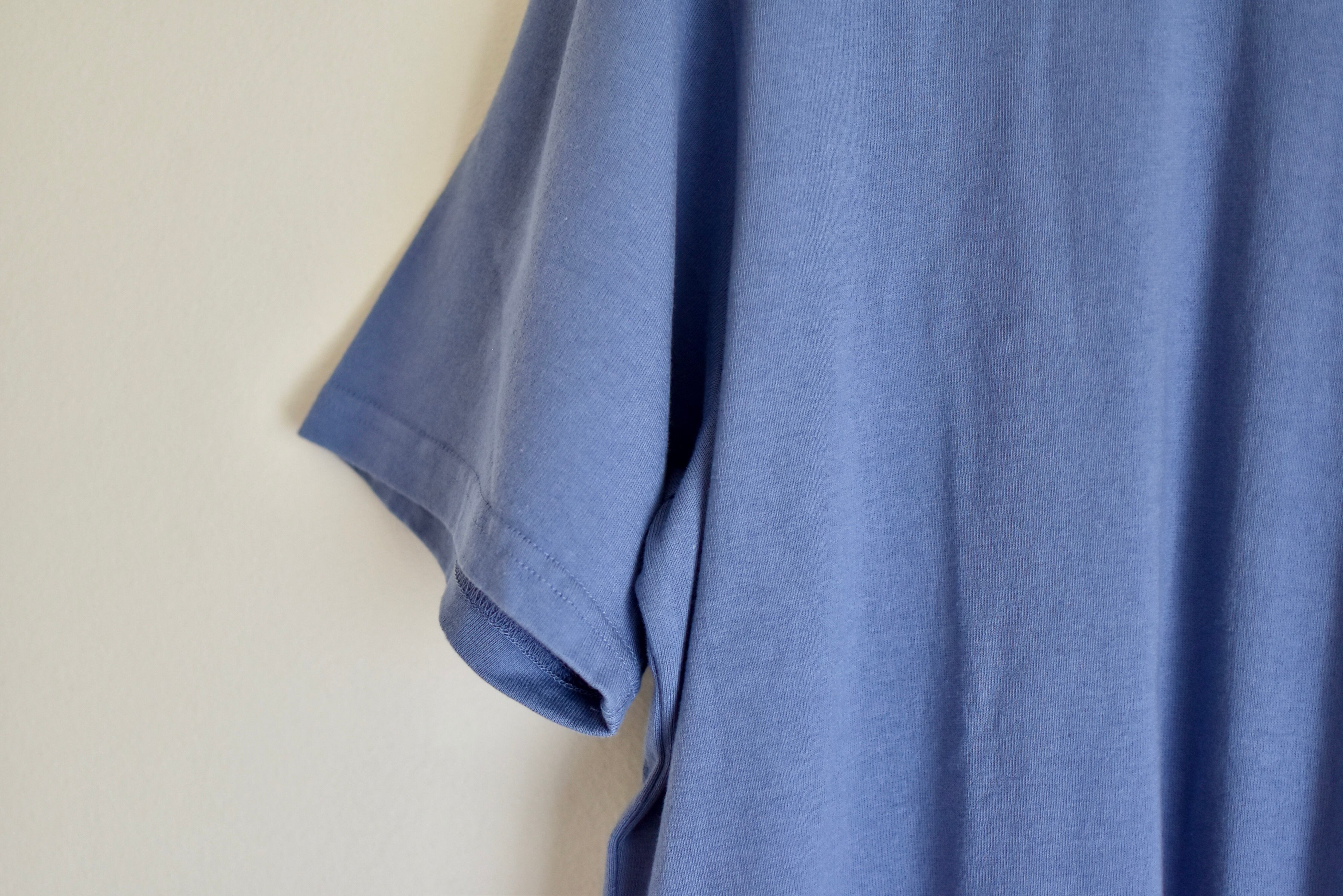 和歌山の吊り編み機で作られたヘヴィーウェイトながら柔らかくモチっと質感です。身幅をややゆったりとりリラックスしたシルエットです。独特なナチュラルな染色を施しているので、アタリやムラ感のある経年変化を楽しめるシリーズで、毎日でも着たくなる大人の定番シンプルTです。