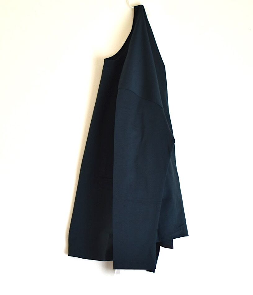 フロントの大きいワークポケット、目の詰まったヘヴィーながらシルケットな生地感、丸みのあるワイドなシルエット、シンプルながらしっかりと個性を感じる一枚です。裾の補強のパイピングも良いアクセントにデザインされています。