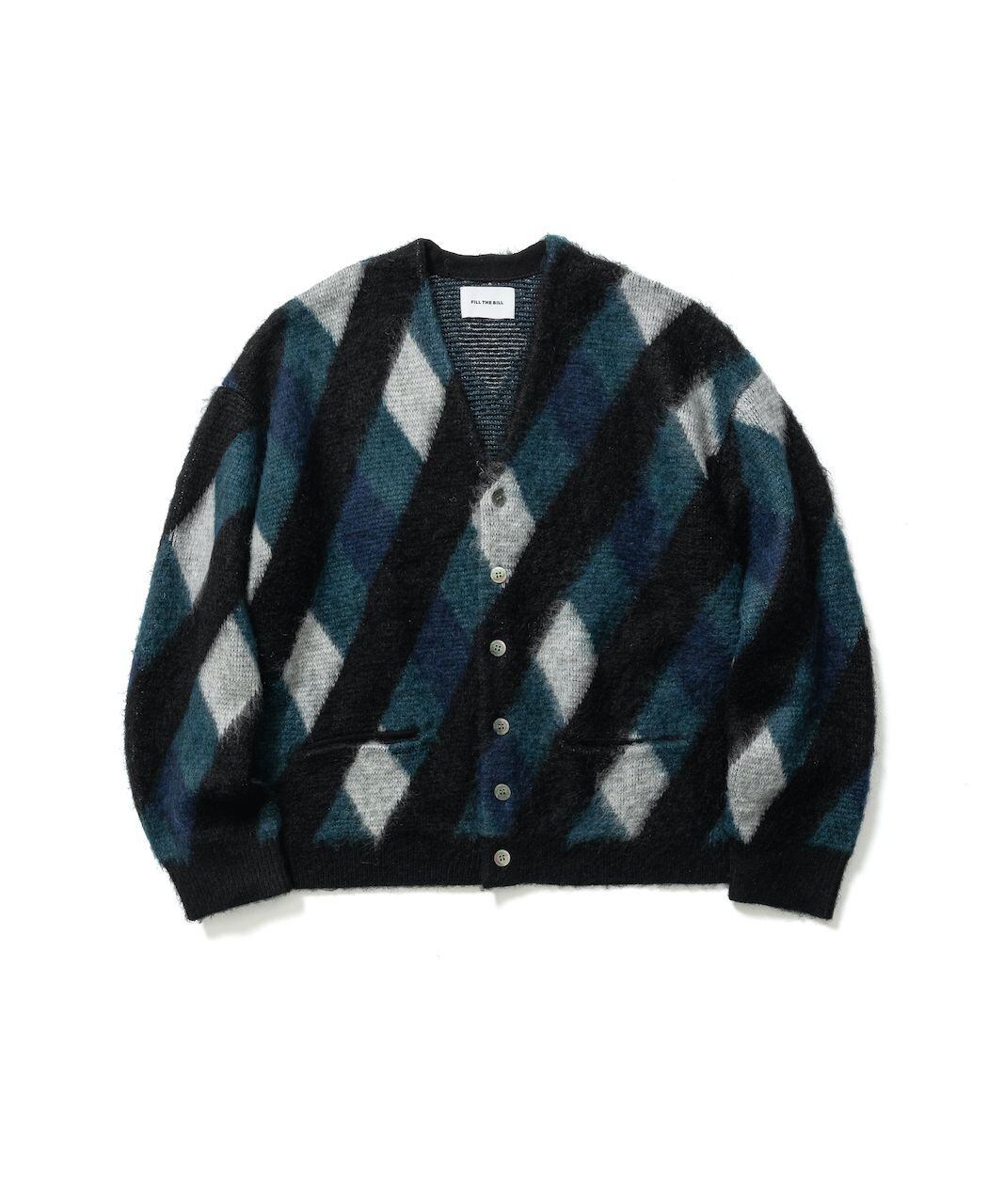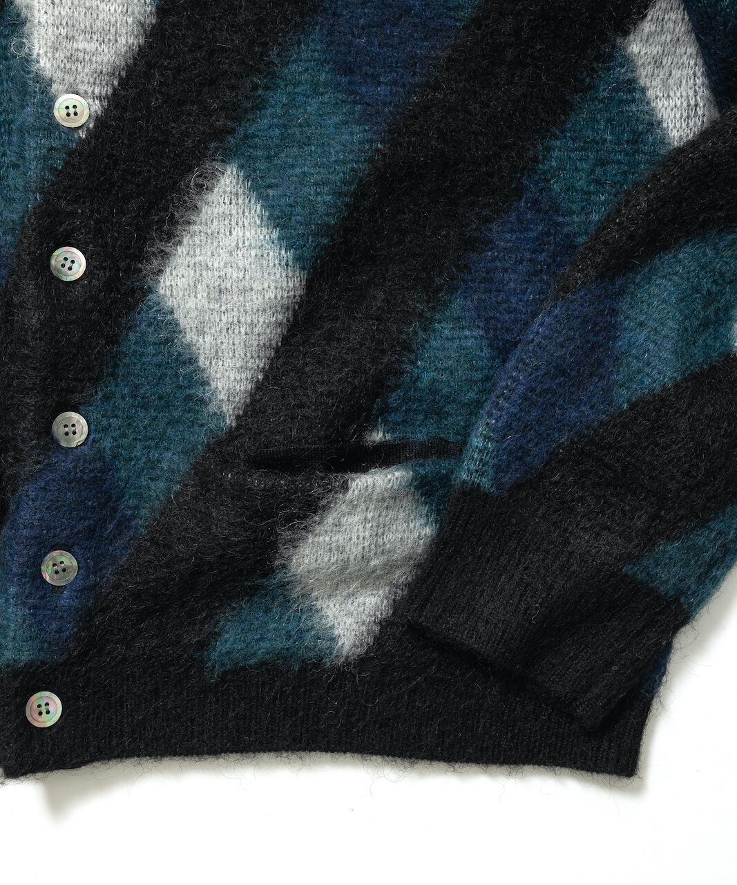斜めのブラックがベタ塗りされた柄が特徴的なアーガイル柄ガーディガン。モヘアならではの毛足の長さが雰囲気を強調してます。程よいオーバーサイズシルエットです。