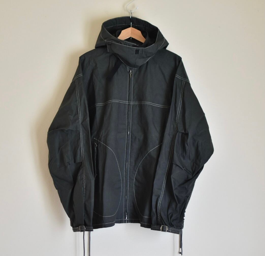 VINTAGEのスポーツジャケットをモディファイしパラフィン加工を施した素材を採用してます。f袖口のベルト、タックを入れてボリュームを出した袖と全体的にボリュームを出したミディアムショート丈のシルエットです。