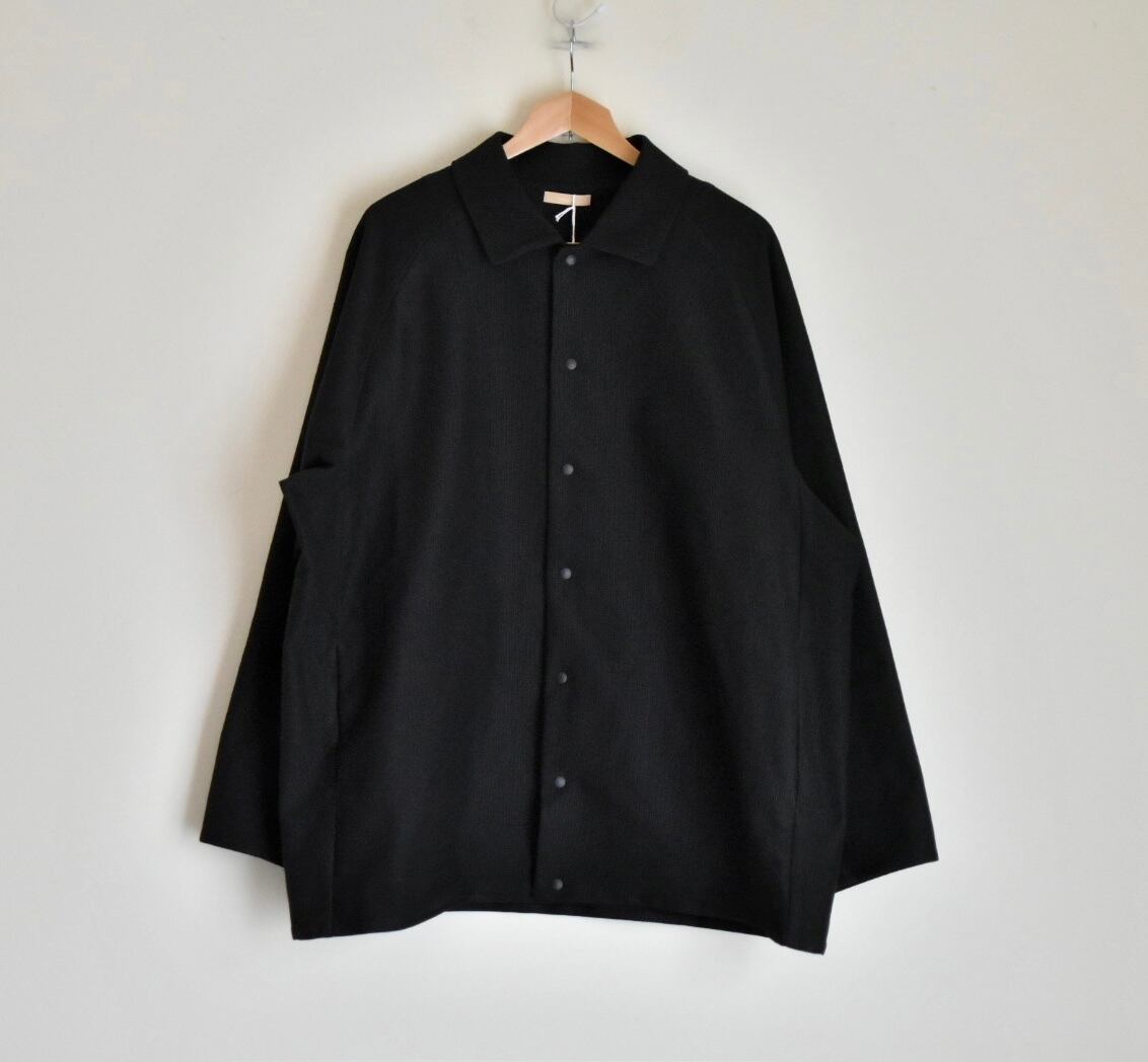 コーチジャケット型のミニマルなジャケットです。毛足のないコーデュロイはピケのような見え方で独自の畝が特徴の通年着れる素材です。組成はストレッチポリエステルで動きやすさと軽さを持ちながら上品でタウンユース仕様に仕上がってます。