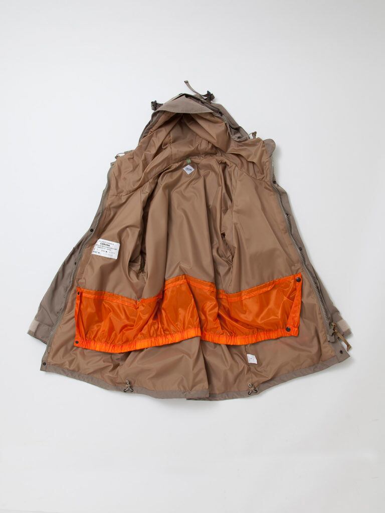 このパーカーコートは、ゴアテックスを生地に使い始めた70年代後半のマウンテンパーカーや80年代・US ARMY ECWCS(Extended Cold Weather Clothing System)レベル4パーカーを原点に、米軍・M-51フィッシュテールパーカー、ROYAL AIRFORCE(英空軍)・FOUL WEATHER JACKET MK3(ファウルウェザージャケット)など多くのソースを取り入れて作ったCORONA完全オリジナルデザインのアウターです。