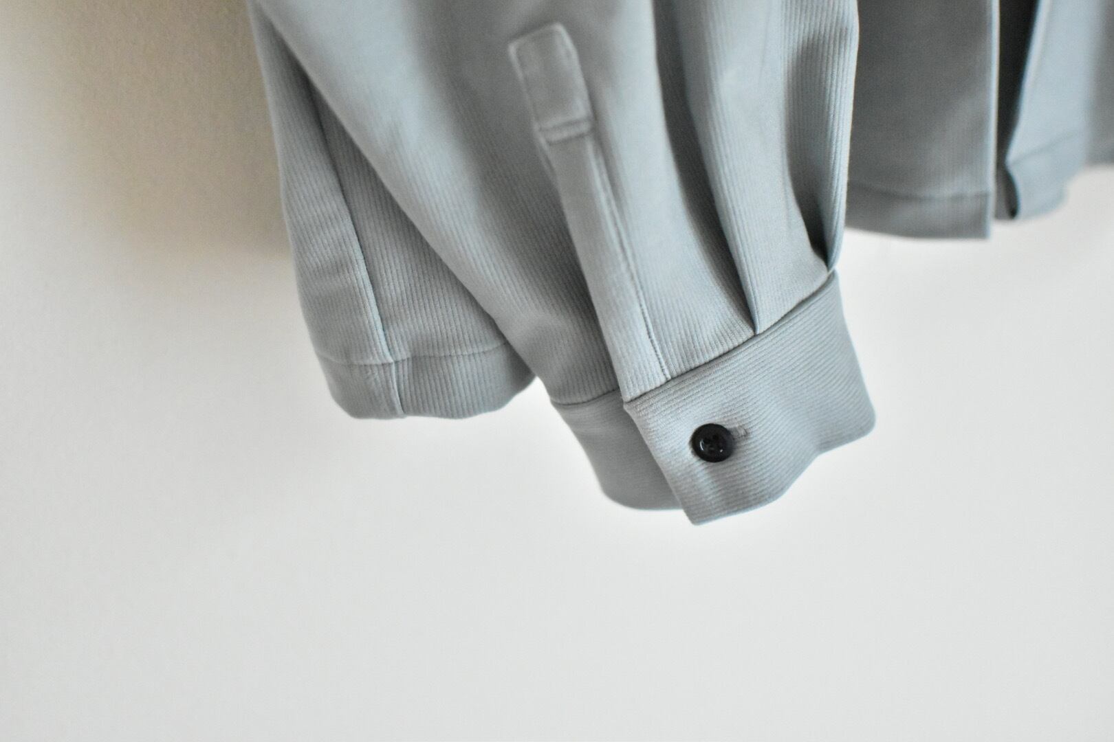 フロントにトメもない保温性の高いコーデュロイ風カットソーのミニマルなシャツ。生地は保温性の他に吸放湿性を持ったトリコットリブ編みに起毛をかけた滑らかなコーデュロイ風。アウターよりのパターンメイキングで、袖口はカフスをつけシャツの要素もプラス。またフロントに大きめのパッチポケットが配置されアクセントをつけております。