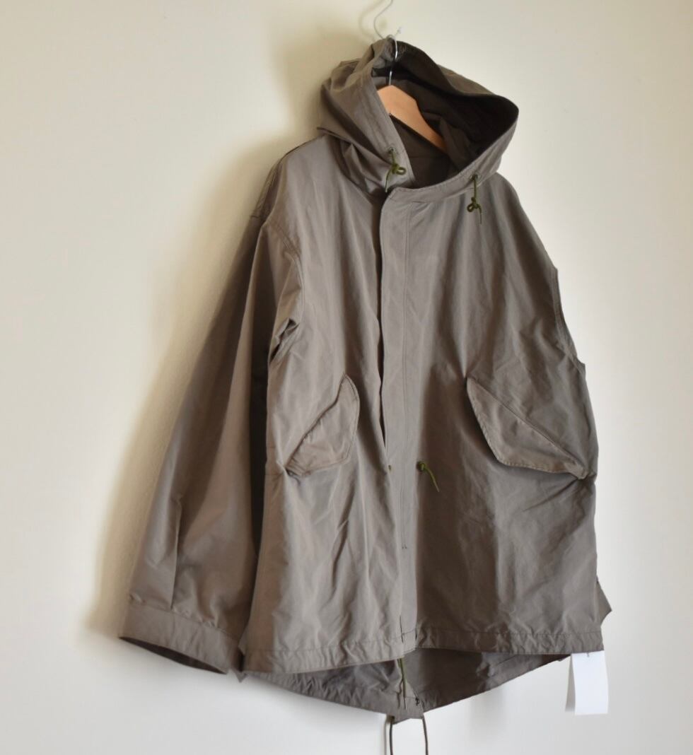生地はナイロン、ポリエステルの高密度ウェザー素材でバサッと羽織れる質感です。表面はややピーチがかったパウダー仕上がりです。