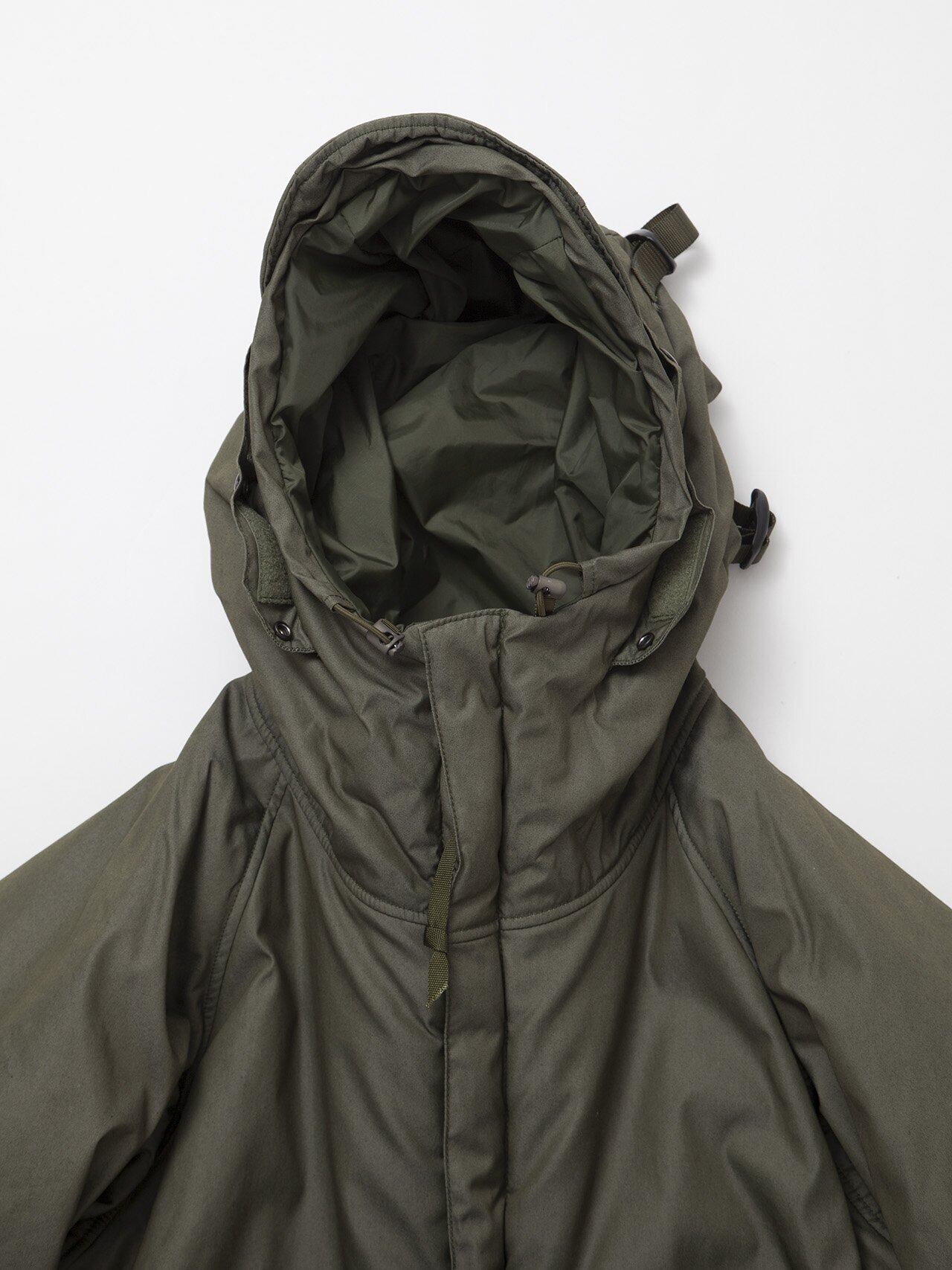 70年代後半、時代が切り替わる過渡期のアウトドアウエアや、ミリタリーユニフォームのオールドスクールな雰囲気とハイテク感を一着の中に表現したようなデザインです。