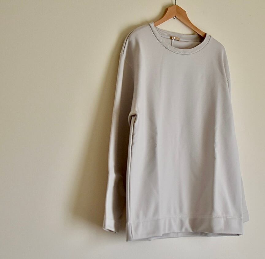 定番的ないわゆるスウェットではなく袖口、裾口のリブを無くし、全体を3本針ステッチで仕上げ、表面には光沢感を持たせたジャージ風裏毛。 ポリエステル55%コットン45%のふくらみのある裏毛組織で編み立ててで伸縮性の加わったリラックス感のある裏毛素材です。斜めの畝のあるカルゼ調の表情が綺麗な見え方のする大人モダンなスウェットです。