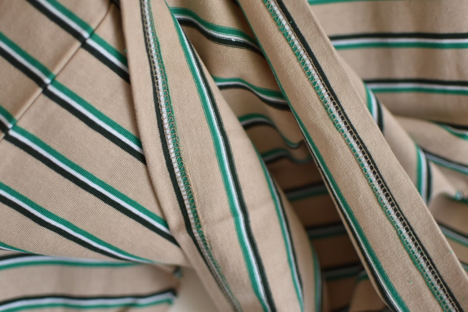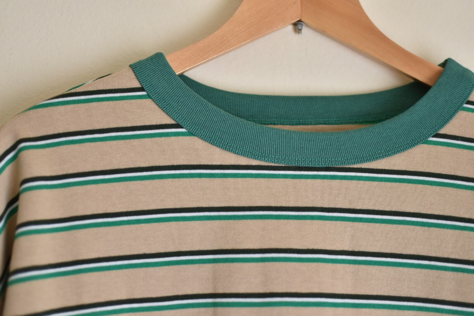 どことなく懐かしレトロなマルチボーダーロングTEE、襟と袖の配色リブがデザインの引き締め役になっています。全体的にゆったりシルエットで広いアームホールから袖が丸くなったペリカンスリーブが特徴です。
