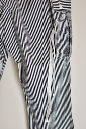 デニム織物の風合いを損なわない限界まで糸を細くして高密度に織ったヒッコリーストライプです。