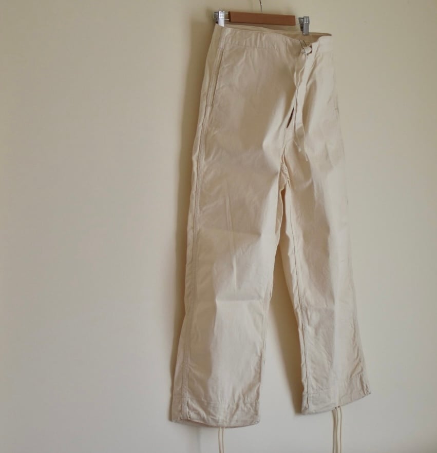 ウエストはゴムの入らない仕様ですが、絞りやすいようにトップ釦は無く、ドローに使っている生地もバイアス(斜め)に取り伸縮性を持たせています。