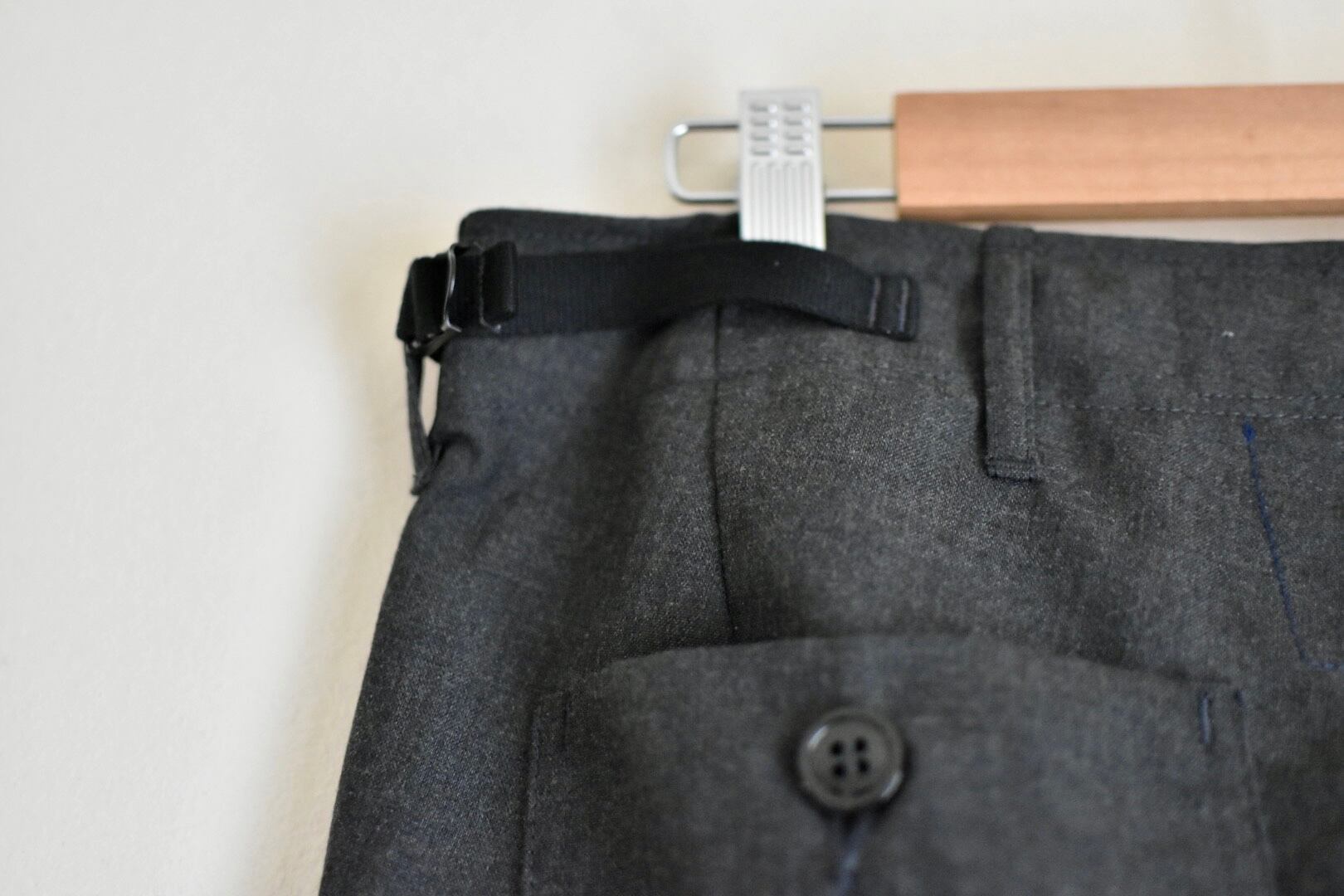 前後4つのパッチポケットのシンプルなディテールですが、膝に2本のタックが入る立体的な身頃の作りとなっています。