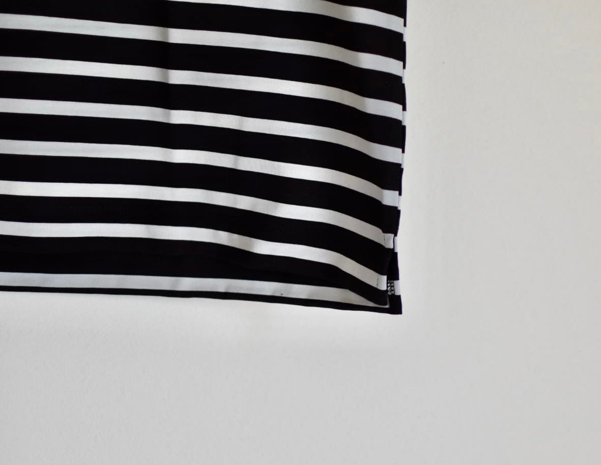 天竺ながら厚みのある肉感と美しい光沢感、ボーダー配色が上品な表情を生み出しています。