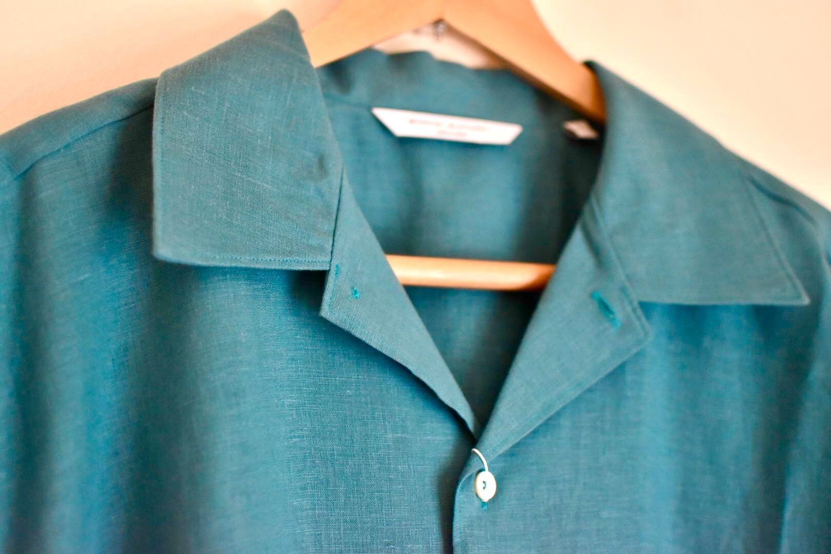 フレンチリネンキャンバスを使用したワンナップカラーのショートスリーブシャツ。