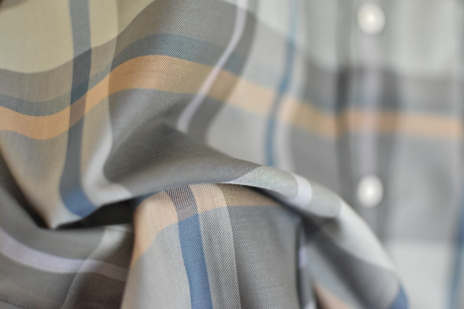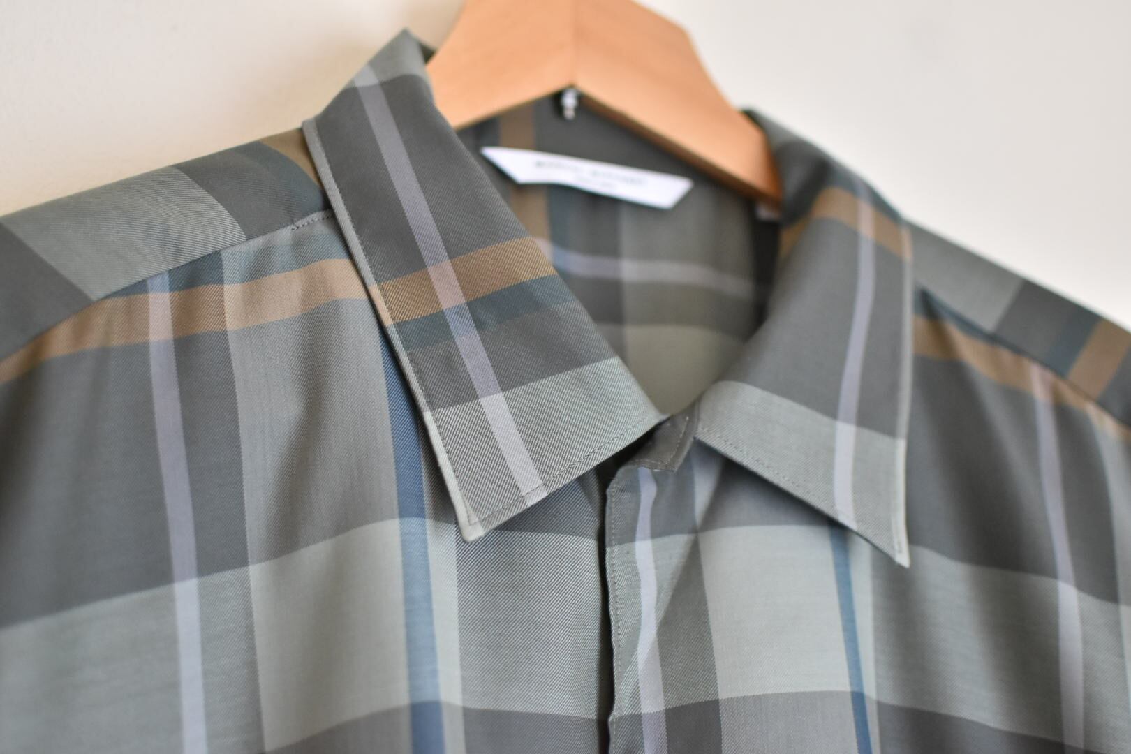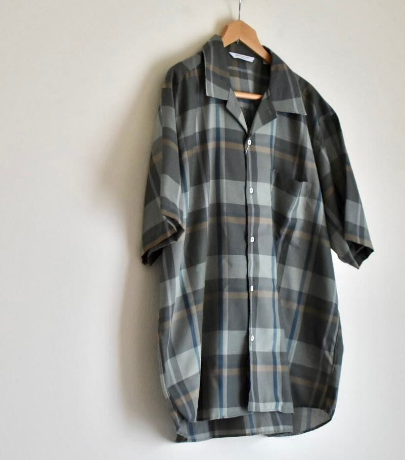 野暮ったくなりがちなチェックシャツを落ち着いて大判柄でとろみのあるポリエルテルを使うことで上品かつ新鮮な見え方があり新しい印象です。